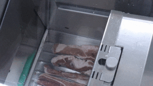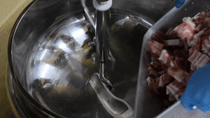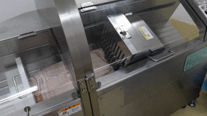 豚バラ肉の端材をカットの機械で、厚さ8mmの短冊カット