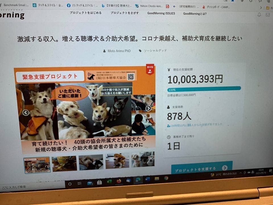 600名さまからのお力添えで、第一ゴール750万円に9月8日に達成いたしました。 ありがたくて、心が震えています。心から感謝申し上げます。ありがとうございます。 その次の日に、750万円ものご支援をいただいているにもかかわらず、心苦しいのですが、第2ゴールもお願いしなくてはならないことになりました。 聴導犬・介助犬クラウドファンディング 終了まで、あと2日。引き続き、シェアとご支援をお願いできませんか?