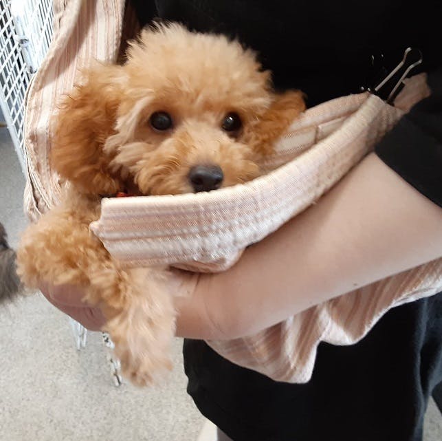 ※写真は、新人しおのちゃん。ワクチン2回接種は終わっていますが、大型犬が自由にしている施設なので、安全を図って、スタッフ交替で抱っこ袋での社会化中。毎日が社会化です。候補犬たちの訓練は、順調に進んでいます。