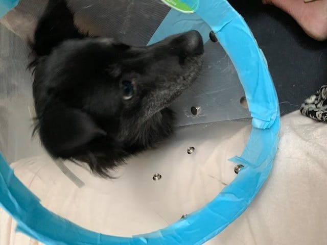 みなさまからのお力添えの賜物で、ひさちゃん「低侵襲治療」で避妊手術を受けました。術後すぐにご飯をパクパク食べてました! ひさちゃんをはじめ、候補犬たちが訓練に入る前に、避妊手術を受けなくてはなりません。