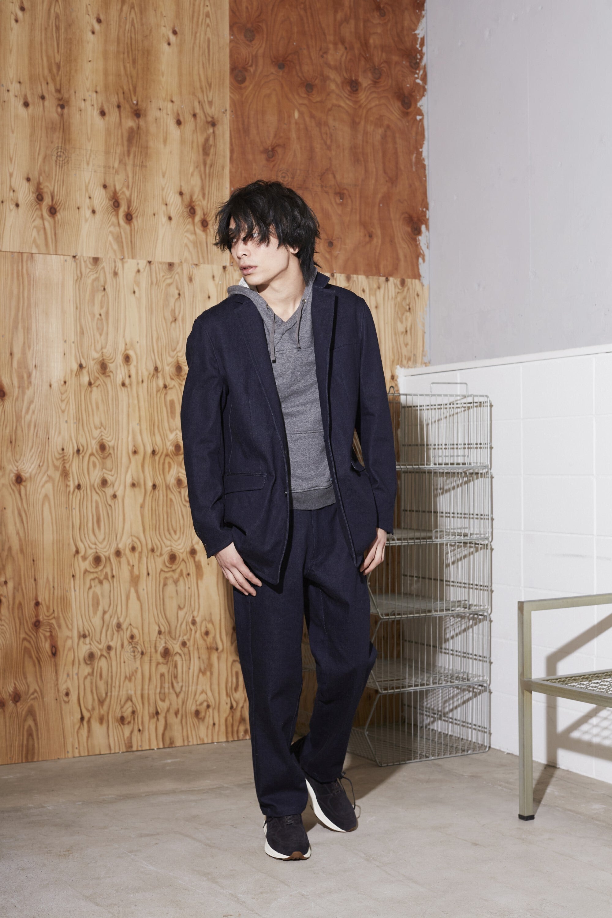 今回のコーディネートは、ネイビーのセットアップのインナーにグレーのフーディーを合わせるスタイルです。