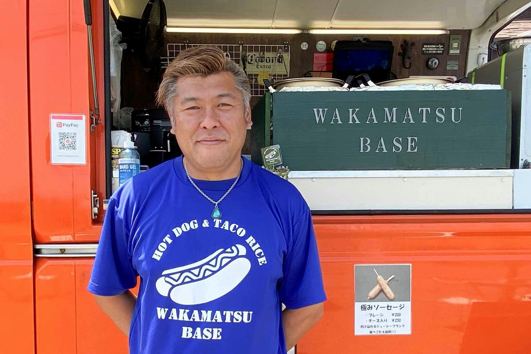 キッチンカー「WAKAMATSU BASE」で若松を中心に、ホットドッグやタコライスを販売される前田さん。
