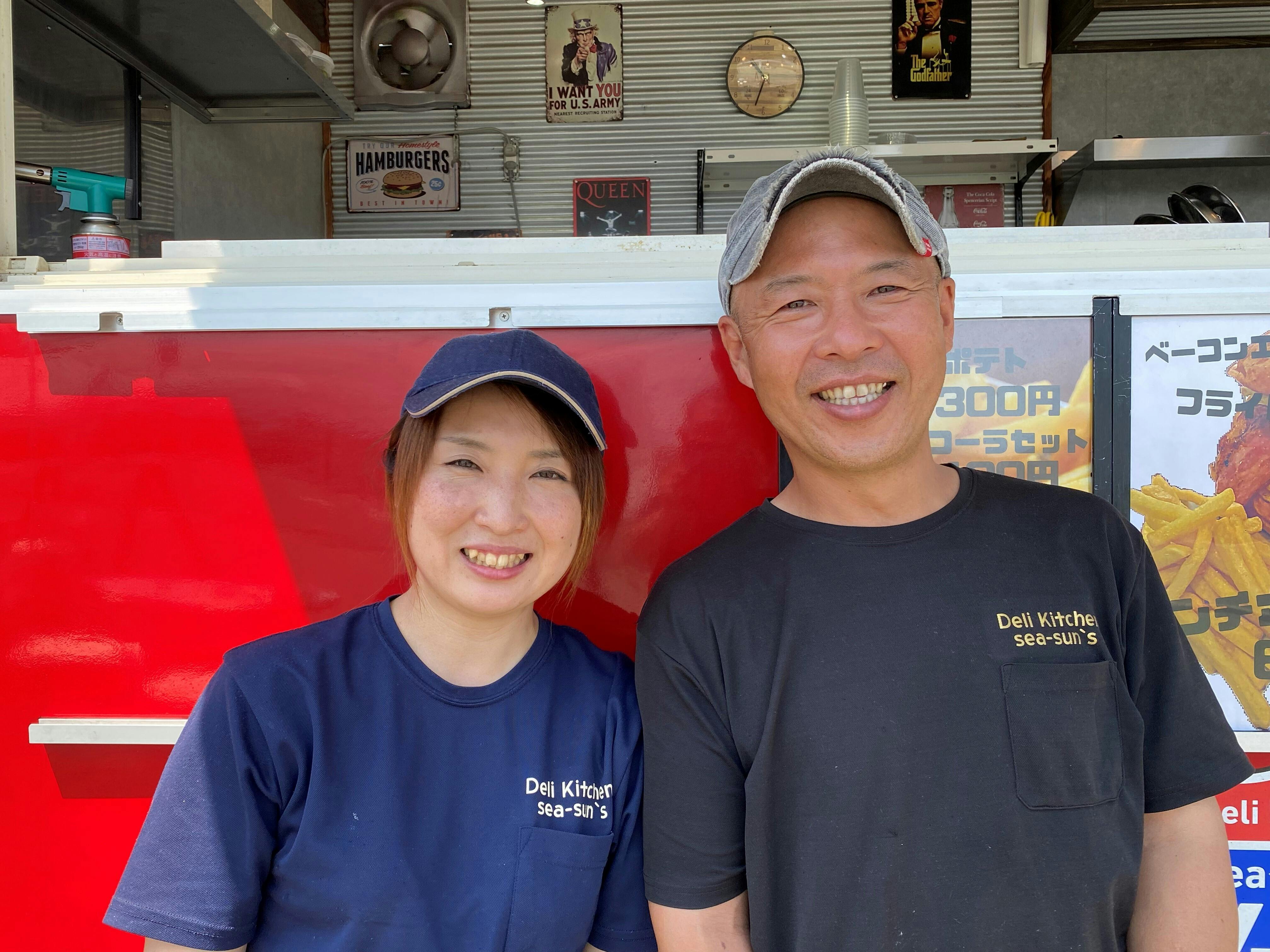 福津を中心にキッチンカーで「本気のBURGER」を販売されている「Deli Kitchen sea-sun's」の竹場さんは、ご夫婦二人三脚でキッチンカーを初めて3年目。それ以前は、屋根施工のお仕事で一緒に屋根の上で作業されていたそうで、お二人の息はぴったりです。