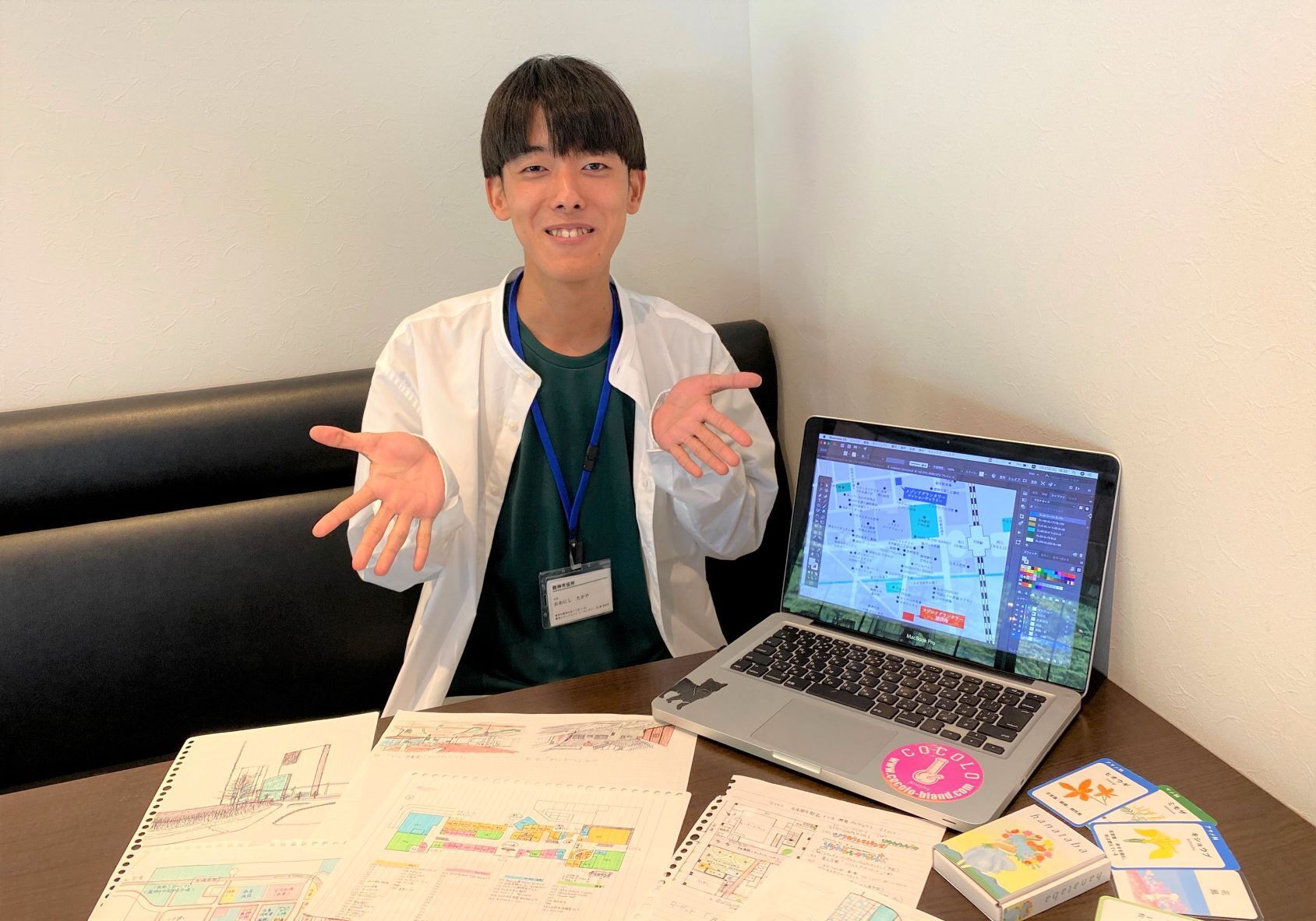ミニカーで遊ぶために絵にかいた駐車場や道路、そこから広がっていった空想のまちづくりは、今でも広がり続けています。中学生のころには、人通りの減っていく商店街をなんとかしようと、自分のプランを市役所に提案したり、高校生のときには、遠賀町のビジネスコンテストで、町の再生プランを発表しました。