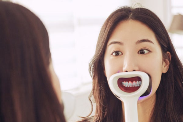 本器のLEDライトで照らした口腔内を、本器の特殊フィルター越しで見ることで、磨き残しの歯垢をピンクの蛍光色で目視できます。汚れを見つけることで、これまで磨き残していた部分も綺麗に磨くことができるようになります。