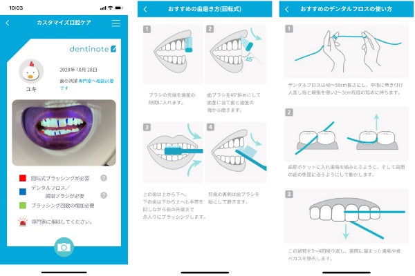アプリのカメラで、口腔状況を撮影することでAIが分析を行い、歯垢のたまりやすい箇所を色別に表示してくれます。その状態による管理方法をイラストで表示、そして専門家への相談の必要性とタイミングをアドバイスします。