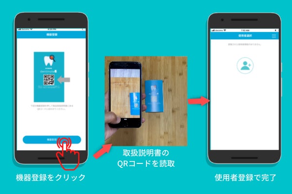 3.ご使用のスマートフォンのタイプに合う専用サイト(App StoreまたはGppgle Play)から歯垢チェッカーdentinoteアプリをダウンロードします。アプリ内の画面に沿ってユーザー登録を行います。登録の最後に取扱説明書のQRコードを読み取り、使用する機器の登録を完了します。