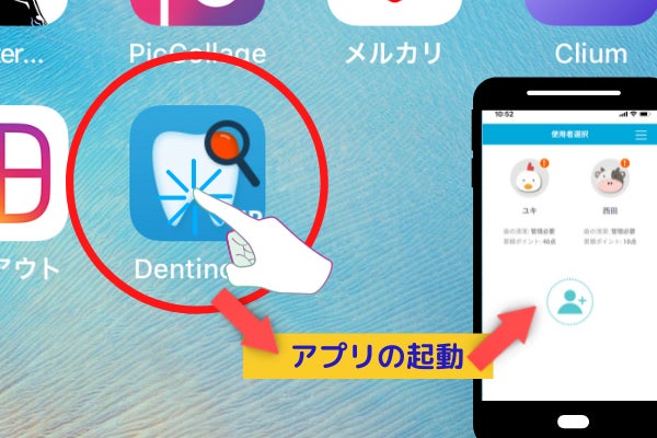 4.歯垢チェッカーによる磨き残しのチェックは毎日!アプリを活用した分析・記録は少なくとも週一の間隔で行う習慣をつけるといいでしょう。アプリの起動はお使いのスマートフォンにダウンロードされたアプリのアイコンをクリックします。