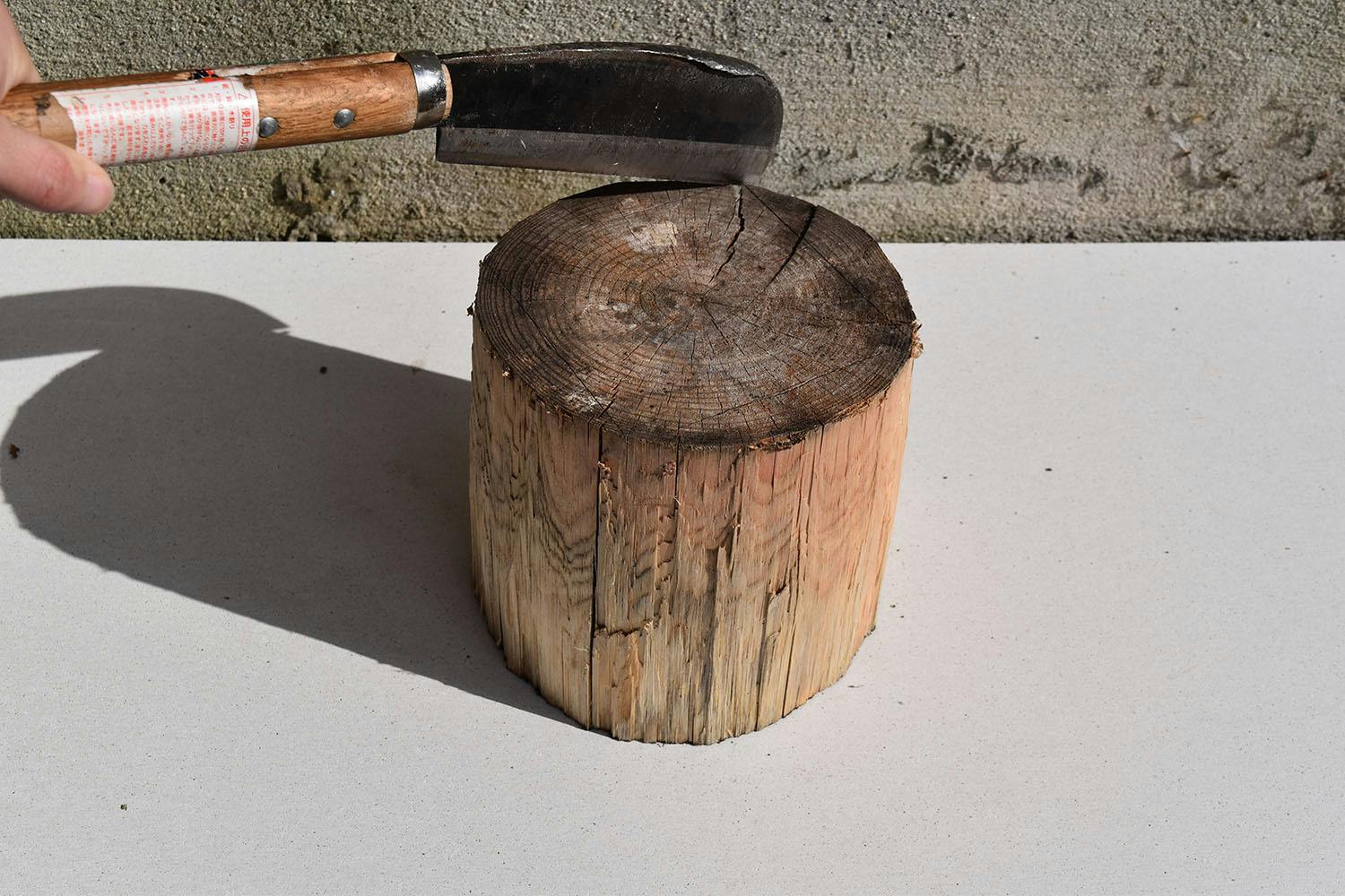 「割り加工」とは・・・下の写真のようにナタや斧を木材に当てて木材を割って加工する方法のことです。薪割りの際などによく使われる加工法です。木は縦に繊維がはしっており、その繊維に沿って割ることができます。この「割り加工」によって、木が持つ本来の木目を損なわずに加工することが可能です。