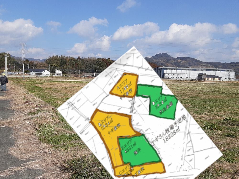 ・昨年末から地権者の方々を調べ13名に地域復興に向けたこの計画を話し、先ずは5年間18228㎡の借地契約を結んだ。