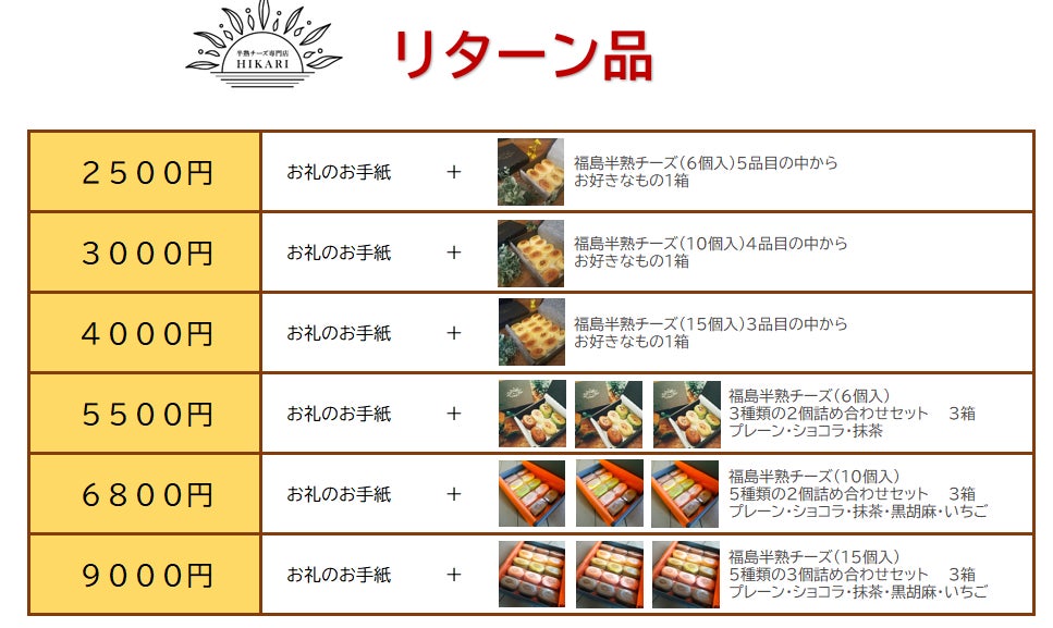 2022/04/01 20:56半熟チーズ専門店HIKARIです。この度、沢山のご縁をいただき4月1日(金)に実店舗オープンする運びとなりました。皆様のご支援、応援のメッセージ本当にありがとうございます。クラウドファンディングを始めた当初、5種類ほどだったチーズケーキも9種類まで増やすことが出来ております。福島県外の方からも沢山のご支援を賜りました。コロナ禍が落ち着いたら是非店舗にご来店いただければ幸いでございます。今後も初心を忘れず、【福島の銘菓】と認知されるように精一杯邁進する所存です。今後とも何卒宜しくお願い致します。半熟チーズ専門店HIKARI代表 阿部正史◇◇◇実店舗概要◇◇◇ 定休日 :毎週火曜営業時間:AM10:00~PM19:00場 所:福島市八島田字勝口27-1(いちい福島西店脇) もっと見る