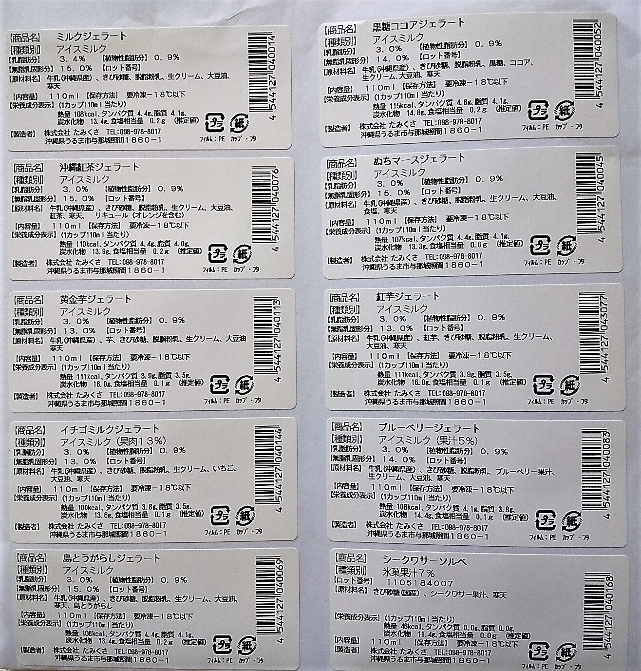 一番カロリーが少ないのはシークワーサーソルベで110mlカップで48kcal、カロリーが比較的多い黄金芋や紅いもでも120kcal以内と一般的なアイスに比べ、かなり低カロリー低脂肪です。