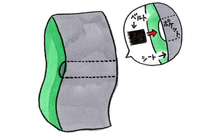 シートベルトをベッドと体の間に滑り込ます際、シートベルト本体だけでは柔らかすぎて通すことが出来ません。その対策として、内部に特殊な芯材を使用する事で装着を簡単にしています。