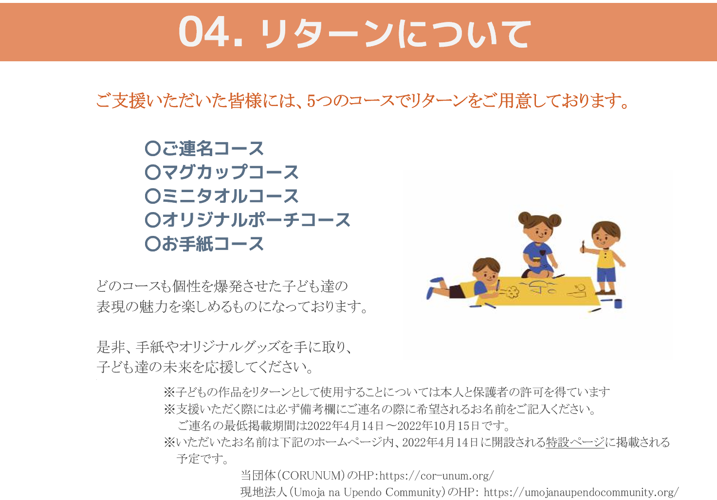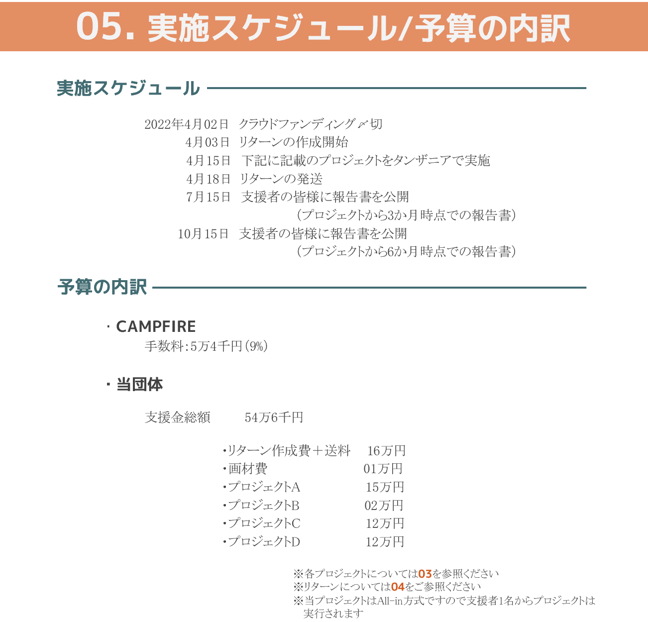プロジェクトページ、リターン記載欄、共通記載欄(https://camp-fire.jp/legal)を