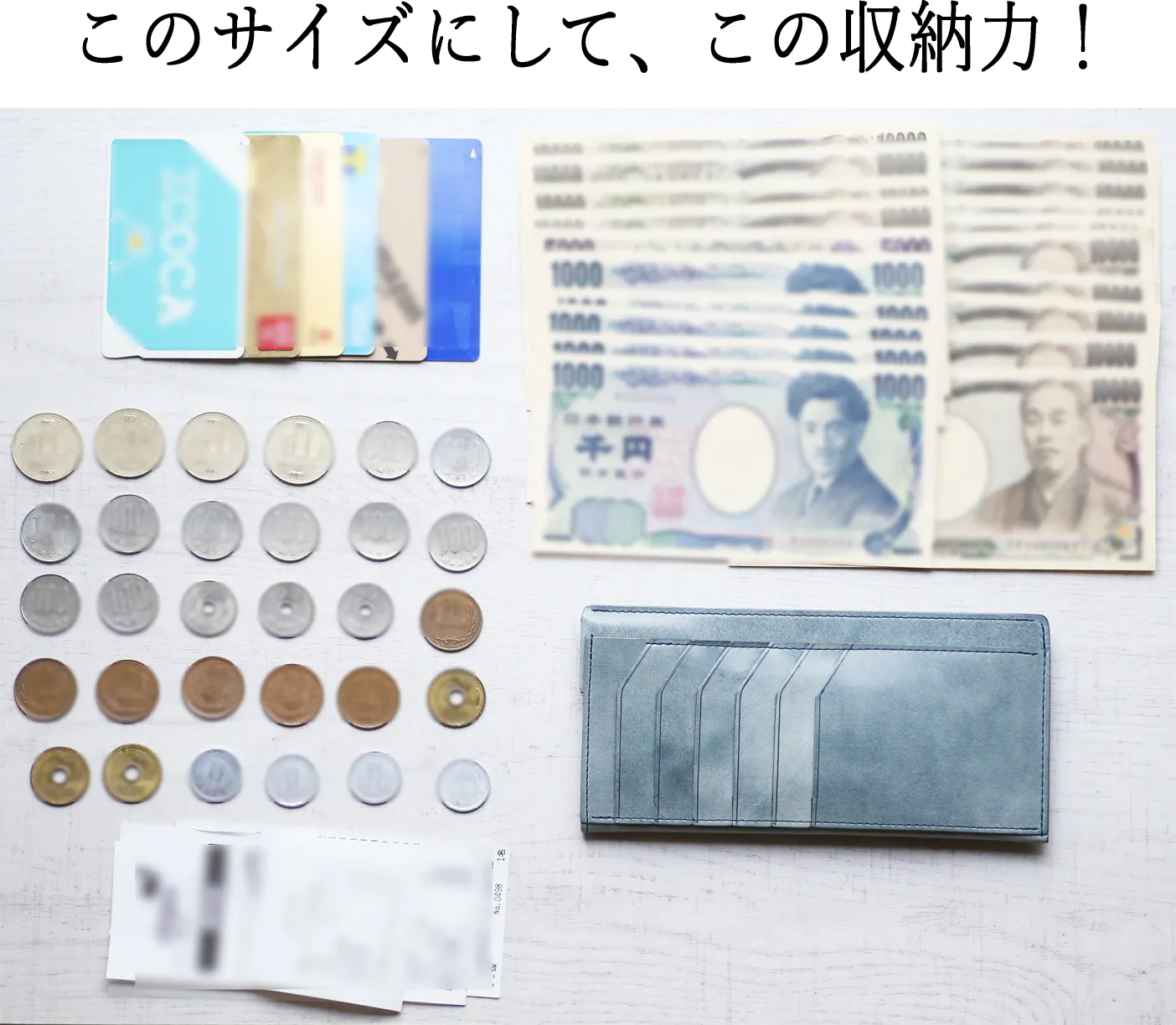 ※レシート入れのスペースは下に向けて振ると落ちる事があります。レシートやクーポン券を長期間保管しない断捨離効果も期待できます。