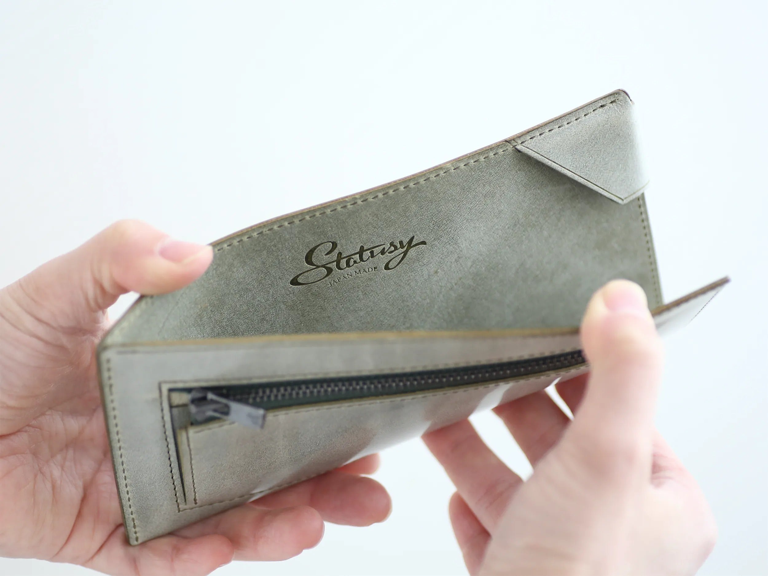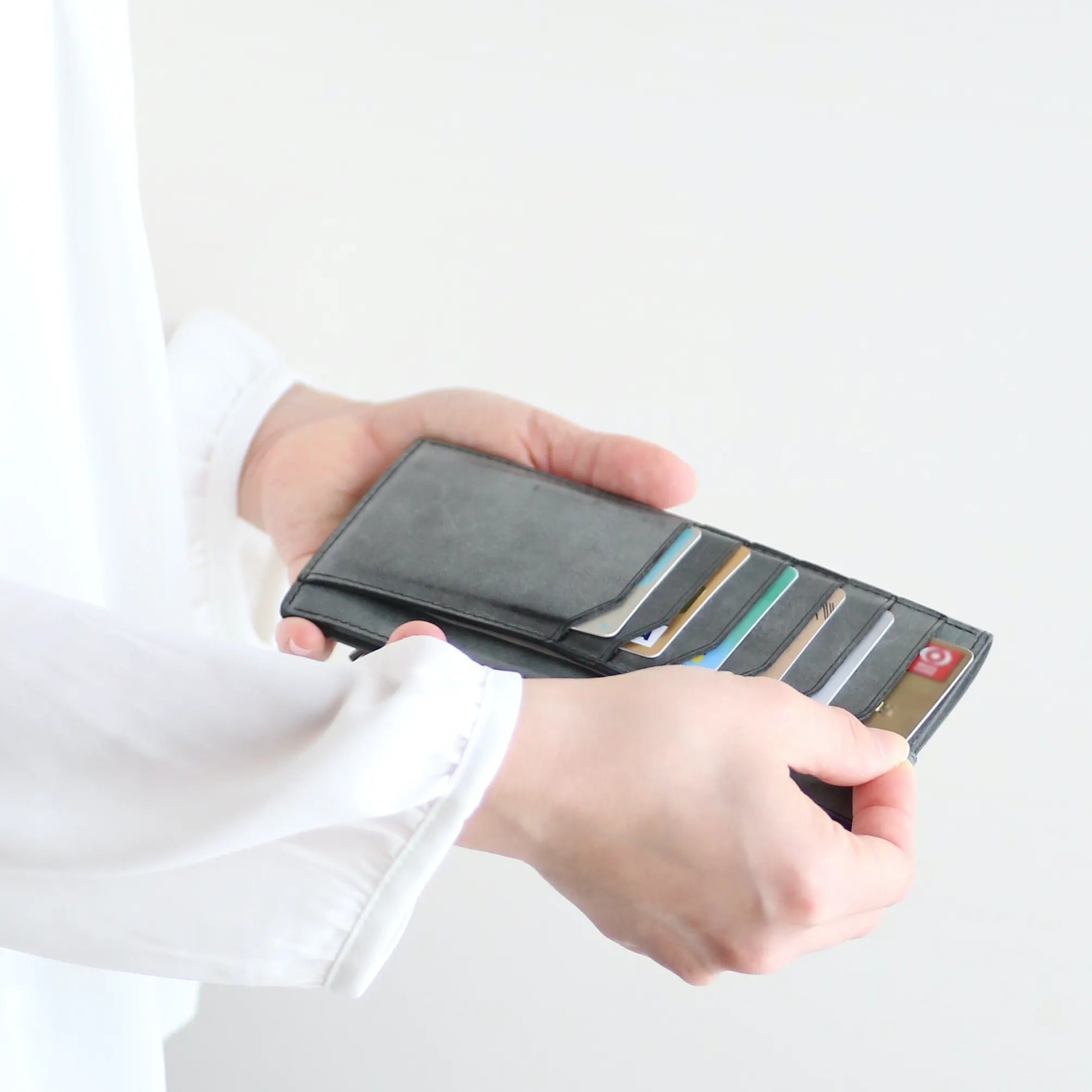 一般的な折り畳み式の長財布であれば、財布を開いてから札入れへアクセスする。ファスナー式の長財布であれば、さらに最初にファスナーをあけるというアクションが追加されます。