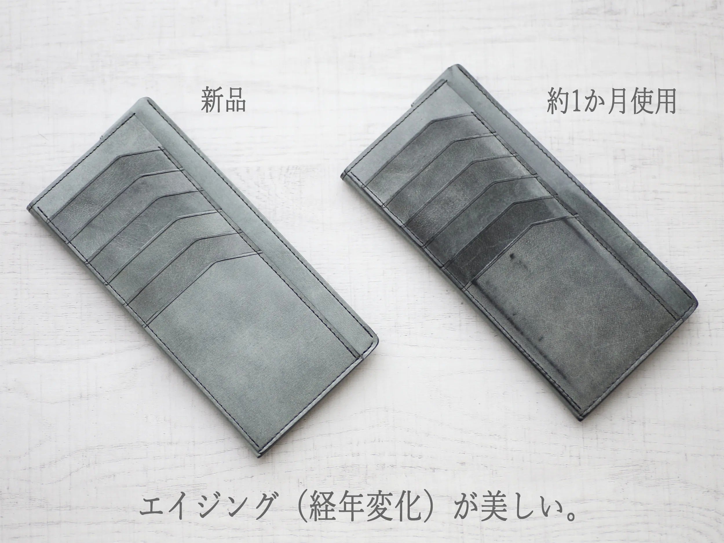 特に栃木レザーのようなタンニン鞣し革はエイジング(経年変化)がよくあらわれ「自ら育てる革」という印象が強いでしょう。