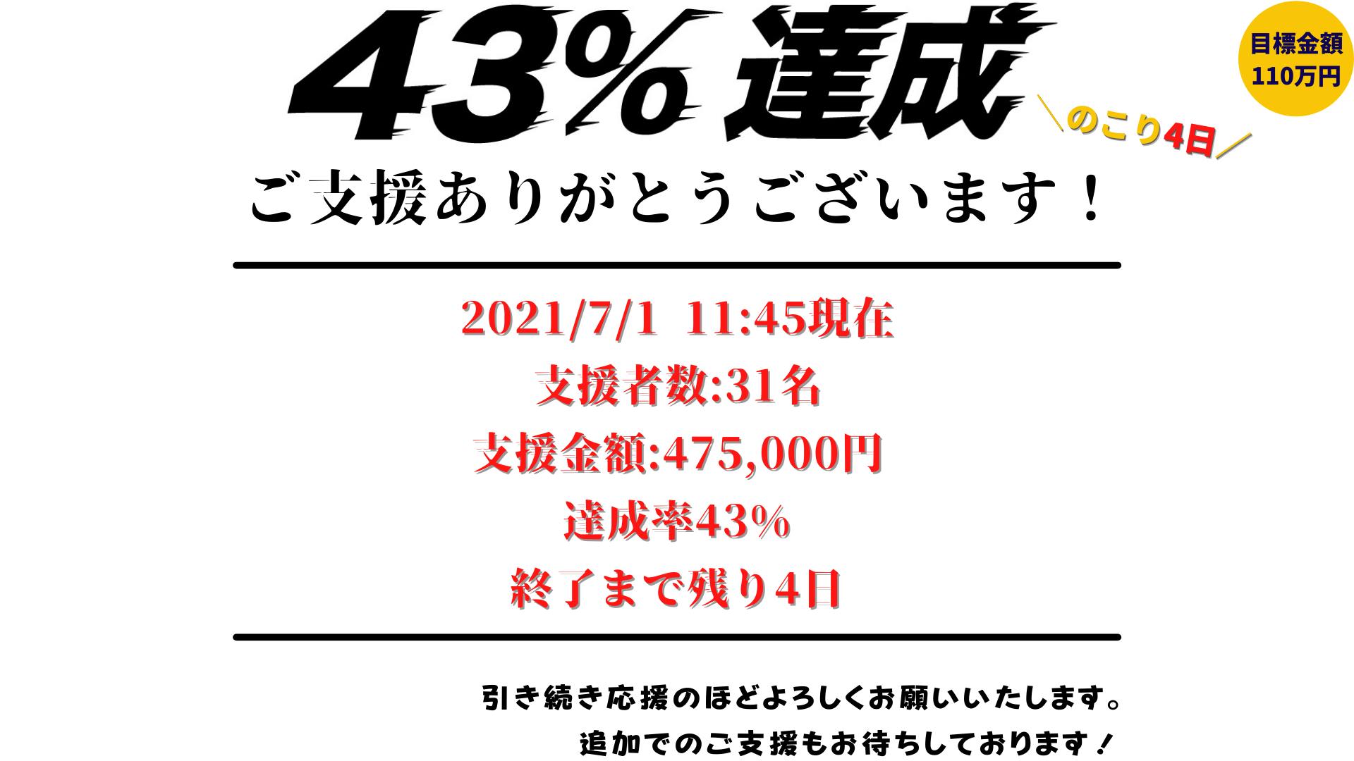 現在31名の支援者さまにご支援いただき、みなさまのおかげで何とか43%時点(475,000円)まで来ることができました。目標金額の 110万円 までは残り 628,000円 となっています。