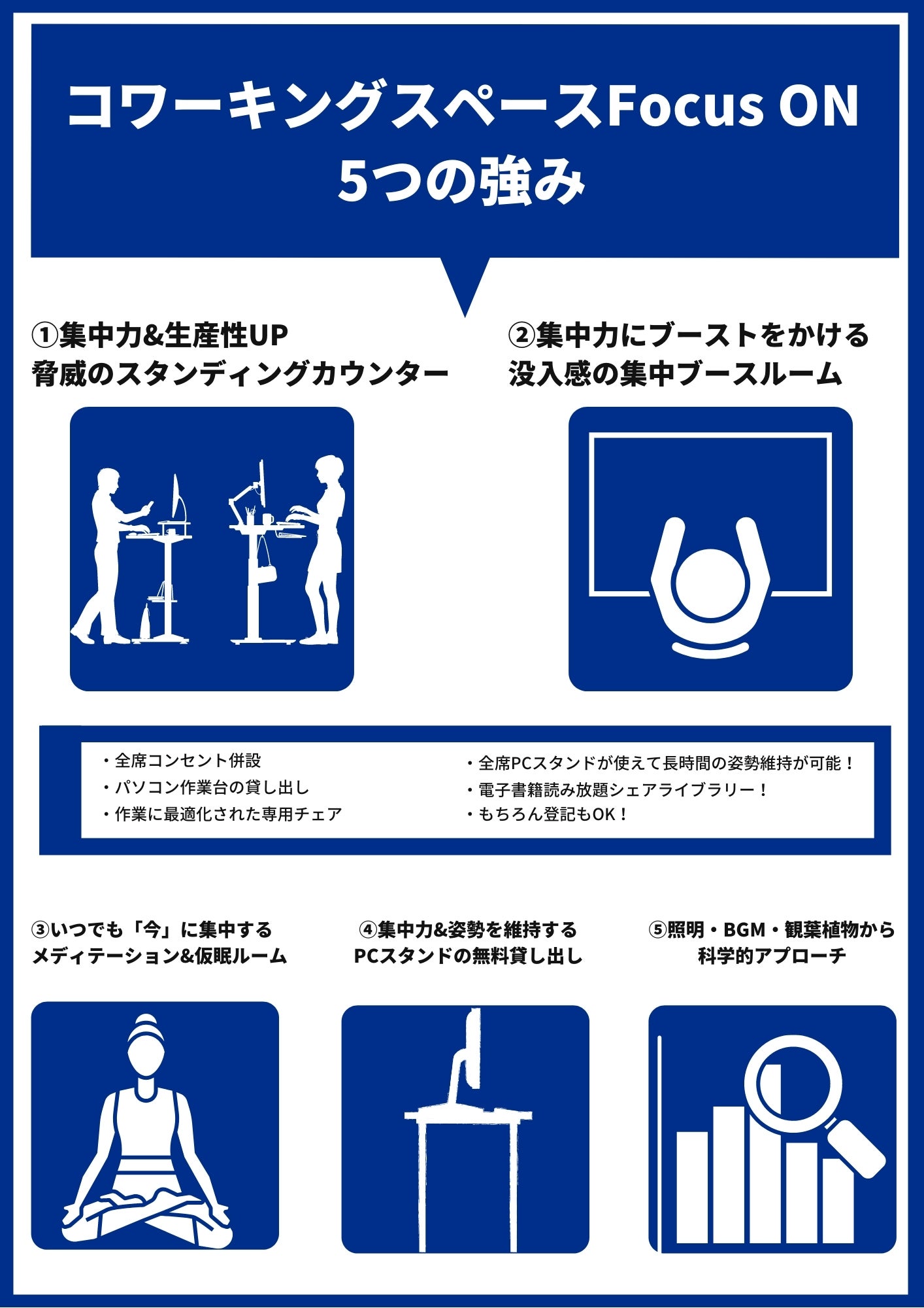これらコワーキングスペースならではの利点は残しつつ、作業をするための環境に「集中」に特化したワークスペース作りを実現していきます。