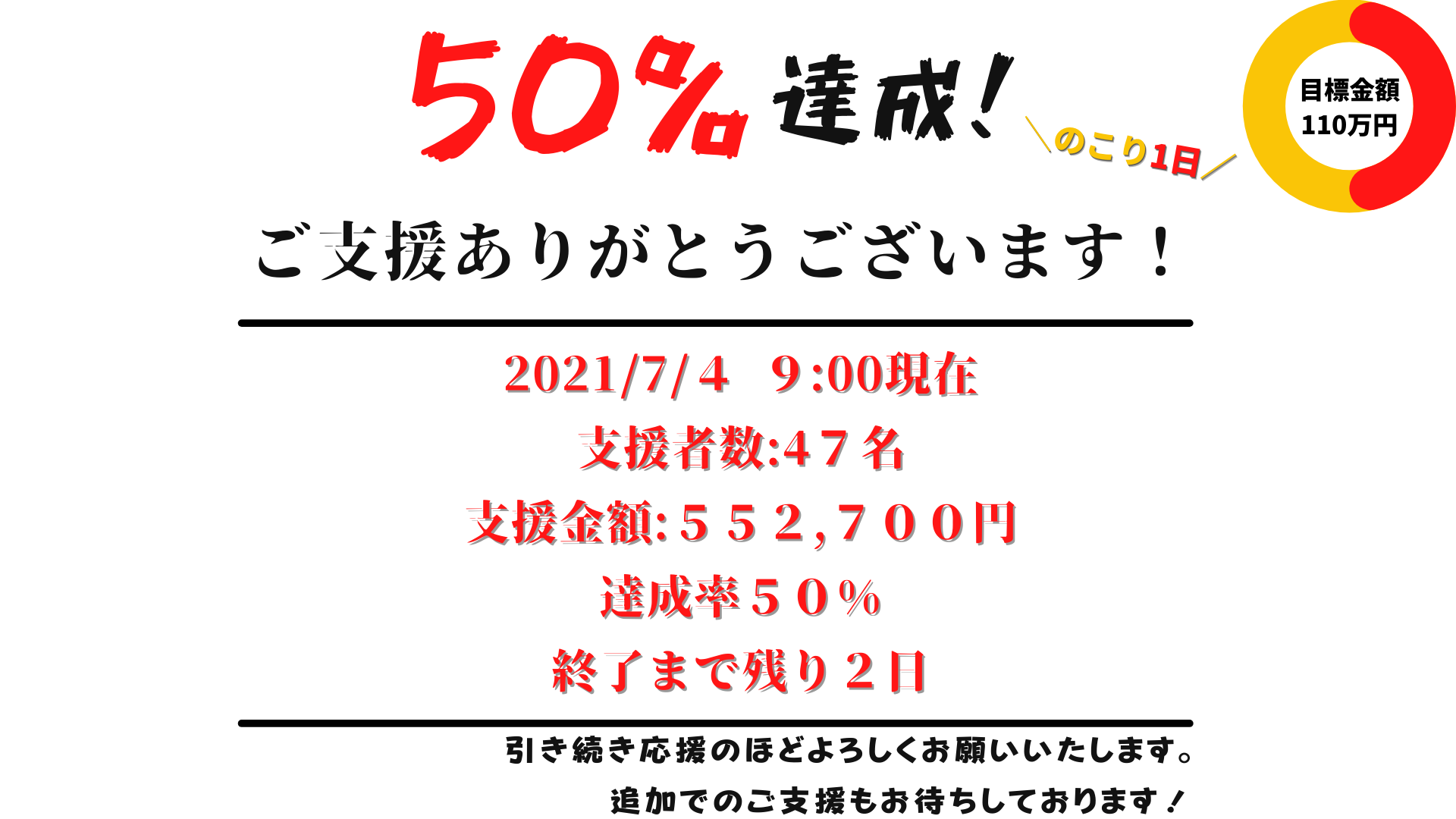 2021/07/05 22:51こんばんは!オーナーの宍戸です!ついにクラウドファンディングの残り時間が【1時間半】を切りました。たくさんの応援メッセージをいただいているのでご紹介させていただきます。ーにれん君、彼女さんもお疲れ様です。熱い友情に感謝!長野県から支援しまーすーしっしーさん最後まで頑張ってください‼お気持ち程度ですがご支援させてもらいます‼今からちょっとパソコン作業するのでコラボできるかわかりませんがラストスパートでたくさんの方から支援貰えること遠い鹿児島から応援してます‼是非鹿児島でまた呑みましょう‼ーファイトー!!ーLIVEは繋がりませんでしたが、気持ちは繋がっていますよ!応援しています!頑張ってください!ー現役クレーンオペです!新たな門出、応援しています!ー支援、頑張れ!ー少額ですが、支援させていただきます!応援してます!ー頑張れしっし!ーしっしーさん応援しています!最後まで全力で駆け抜けていきましょう♪ー吉永さんとにれんくんに助けてもらってるので、応援!残り1日ファイトですー!!!ー遅れました。少ししか支援できんでごめん!ただ応援してます。頑張ってねしっし。突き進めええええええええ!!!ーしっし!がんばれ!応援しとる!ーあと4日!全力お辞儀!!!LIVE配信楽しく拝見させていただいてます✒︎応援しています!頑張って下さい!!ー応援しています!live配信、お邪魔しました!頑張って下さい^_^ーわずかばかりの支援ですが応援しています!頑張ってください!現時点で合計78名の方からご支援をいただいており、ここに載せきれないほどの応援メッセージをいただいてます。今回のプロジェクトを100%で成立させることが、支援者のみなさまに対して1番の恩返しだと感じます。最後の最後までやり切ります。ご支援・応援よろしくお願いします!支援はコチラから可能です。https://camp-fire.jp/projects/view/439248 もっと見る