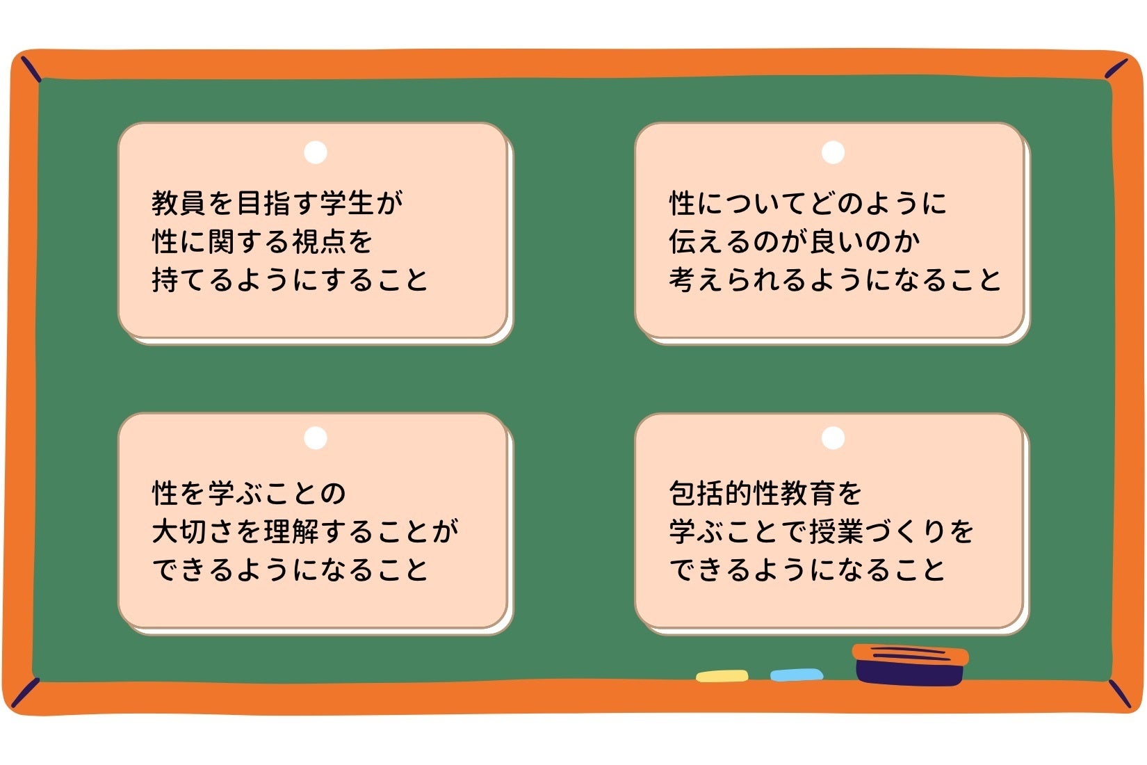 このプログラムを通して「性を伝えることはとても大切なことなんだ」という風に理解していただければ、この先歩む教員人生にはもちろん、あなた自身の人生を歩むときにきっと何かの役に立つはずです。