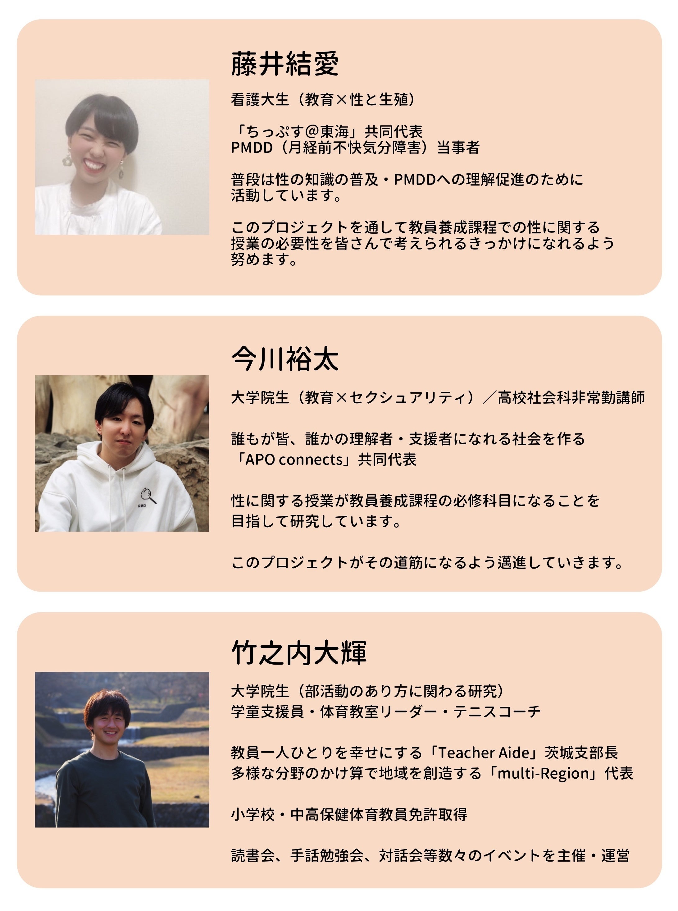 2023/07/20 19:29こんにちは。もあふるオンライン教育実習の今川裕太です。突然すみません!私が今関わっているイベントについてお誘いさせてください。8月11日、12日の2日間、東京のトキワ松学園で「タブーを語る教育サミット」というイベントを開催します。普段それぞれで教育系の法人や学生団体で活動する学生や若手が結集して作っているものです。普段、学校はもちろん、SNSでも語るのがはばかられる教育にまつわるタブーをじっくり語り、考える時間を作ることによって、その日だけでなく、タブー感のある話題についても、話していいんだ!という雰囲気をこの教育の世界に作っていきたいと思っています。それが、教育を少しずつでも前進させていくと信じて、企画しています。もあふるオンライン教育実習でも日頃お世話になっている、講師の先生方にもご登壇いただくので、包括的セクシュアリティ教育についてもより深く学ぶことができます!また、セクシュアリティ×教育の分野にこれまで関心のなかった方々にも届けるチャンスだと思っています。ご興味ある方は、ぜひお誘い合わせの上ご参加いただけると幸いです!詳しい内容と申し込みはイベントページをご覧ください⇩https://taboo-edu-summit.com各セッションのテーマと登壇者 (敬称略) は以下の通りです。① セクシュアリティ × 教育8月11日(金) 10:00~12:00・市川恭平さん (公立小学校養護教諭)・高橋幸子さん (埼玉医科大学産婦人科)・ショウさん (障害者専門風俗はんどめいど倶楽部代表)② 働き方 × 教育8月11日(金) 13:00~15:00・合田哲雄さん (文化庁次長)・戸ヶ崎勤さん (戸田市教育長)・日野田直彦さん (武蔵野大学附属千代田高等学院中高学園長 / 千代田国際中学校長)③ キャリア × 教育8月11日(金) 15:30~17:30・村上聡恵さん (小金井市立南小学校)・蓑手章吾さん (HILLOCK初等部校長)・柴山翔太さん (福岡女子商業高校長)④ 特別支援 × 教育 8月12日(土) 10:00~12:00 ・野口晃菜さん (一般社団法人UNIVA理事)・西郷孝彦さん (元桜丘中学校長)・副島賢和さん (昭和大学大学院保健医療学研究科准教授) ⑤ 不登校 × 教育8月12日(土) 13:00~15:00・坂田聖一郎さん (株式会社ドラゴン教育革命代表取締役) ・小川涼太郎さん (株式会社スダチ代表取締役)・大塚玲子さん (フリーランスライター) ⑥ 若者の不満8月12日(土)15:30~17:30・小泉志信 (一般社団法人まなびぱれっと代表理事)・田中あゆみ (一般社団法人lightful代表理事)・櫃割仁平 (Teacher Aide 共同代表 / 京都大学大学院教育学研究科)・今川裕太 (もあふるオンライン教育実習共同代表)・竹之内大輝 (同共同代表)・服部ももえ (同副代表)詳しい内容と申し込みはイベントページをご覧ください⇩https://taboo-edu-summit.com最後までお読みくださり、ありがとうございました。ご検討よろしくお願い致します! もっと見る