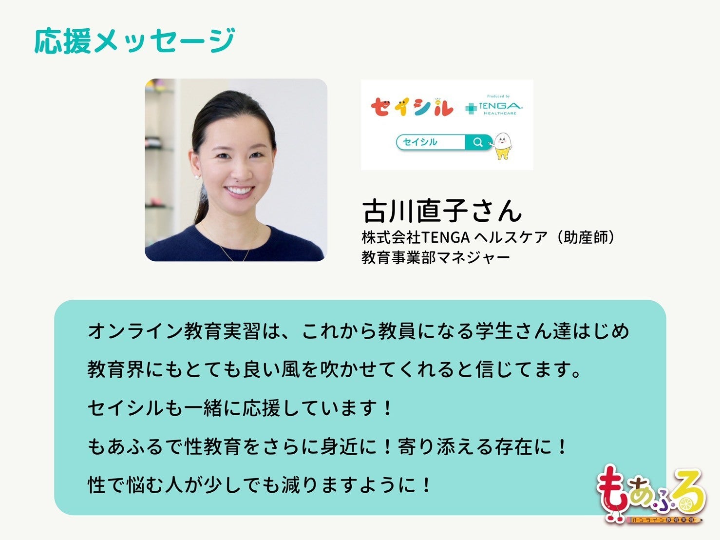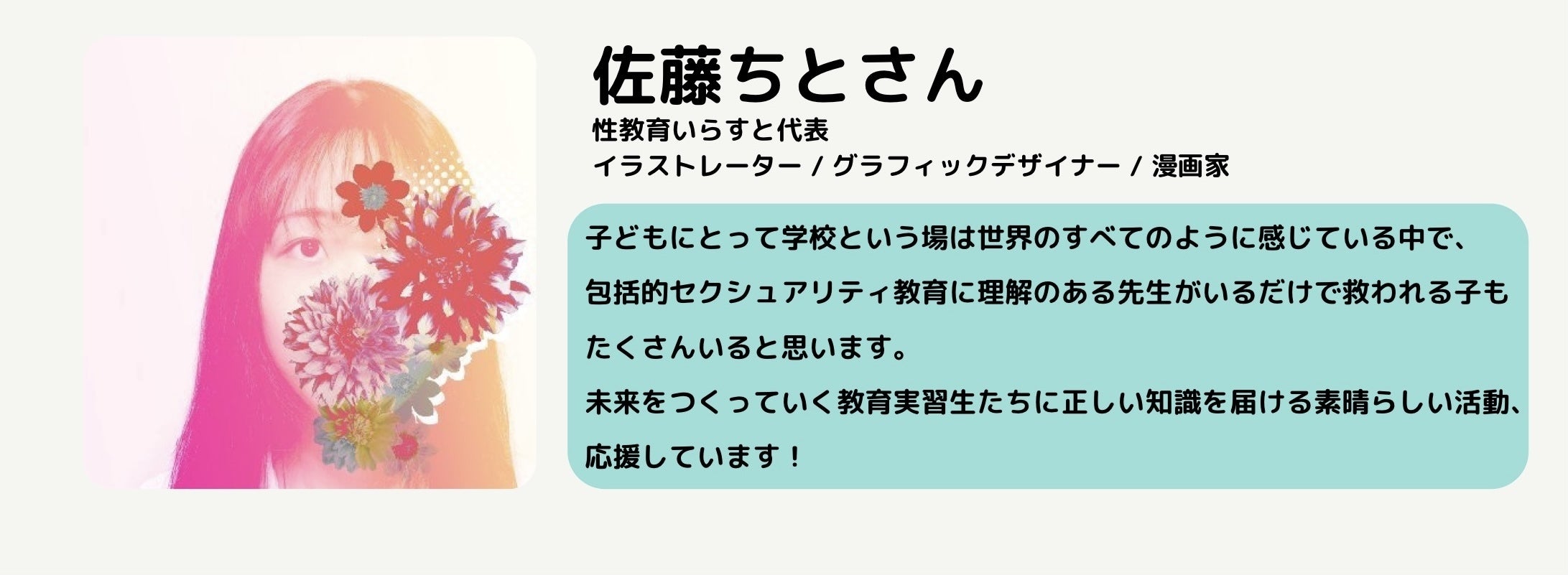 こんにちは!もあふる運営の吉村奈津(なっちゃん)です!新たに、佐藤ちとさんから応援メッセージをいただきました!ちとさん、本当にありがとうございます!ちとさんは、都内でグラフィックデザイナーとして活躍されながら、無料イラスト素材集、性教育イラストも運営されております。(ちとさんのTwitterはこちら)また、今回は、応援メッセージだけでなく、性教育イラストの一部もご提供いただきました。(性教育イラストのTwitterはこちら)本当にありがとうございます!今後、毎日の活動報告などで使用させていただきます!ぜひ、皆さんにもチェックしていただきたいです!募集期限も、残りわずかになってきました。ここから、さらに皆さんのお力が必要になります。ぜひ、ご支援・拡散等していただけると嬉しいです!よろしくお願いいたします!最後までお読みいただきありがとうございました!