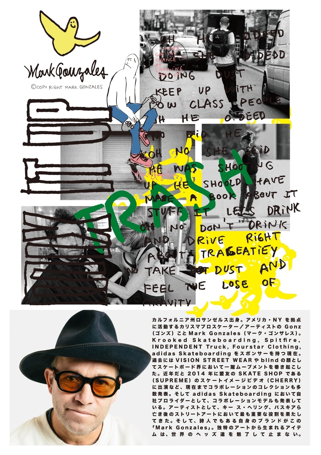 世界で最も影響力があるとされているレジェンドスケーター、Mark Gonzales(マーク・ゴンザレス)。「Mark Gonzales」は、自身の名を冠して立ち上げた 世界中で愛されるファッションブランドで、adidas や Supremeなど有名アパレルメーカーとも数多くコラボレートされてきました。