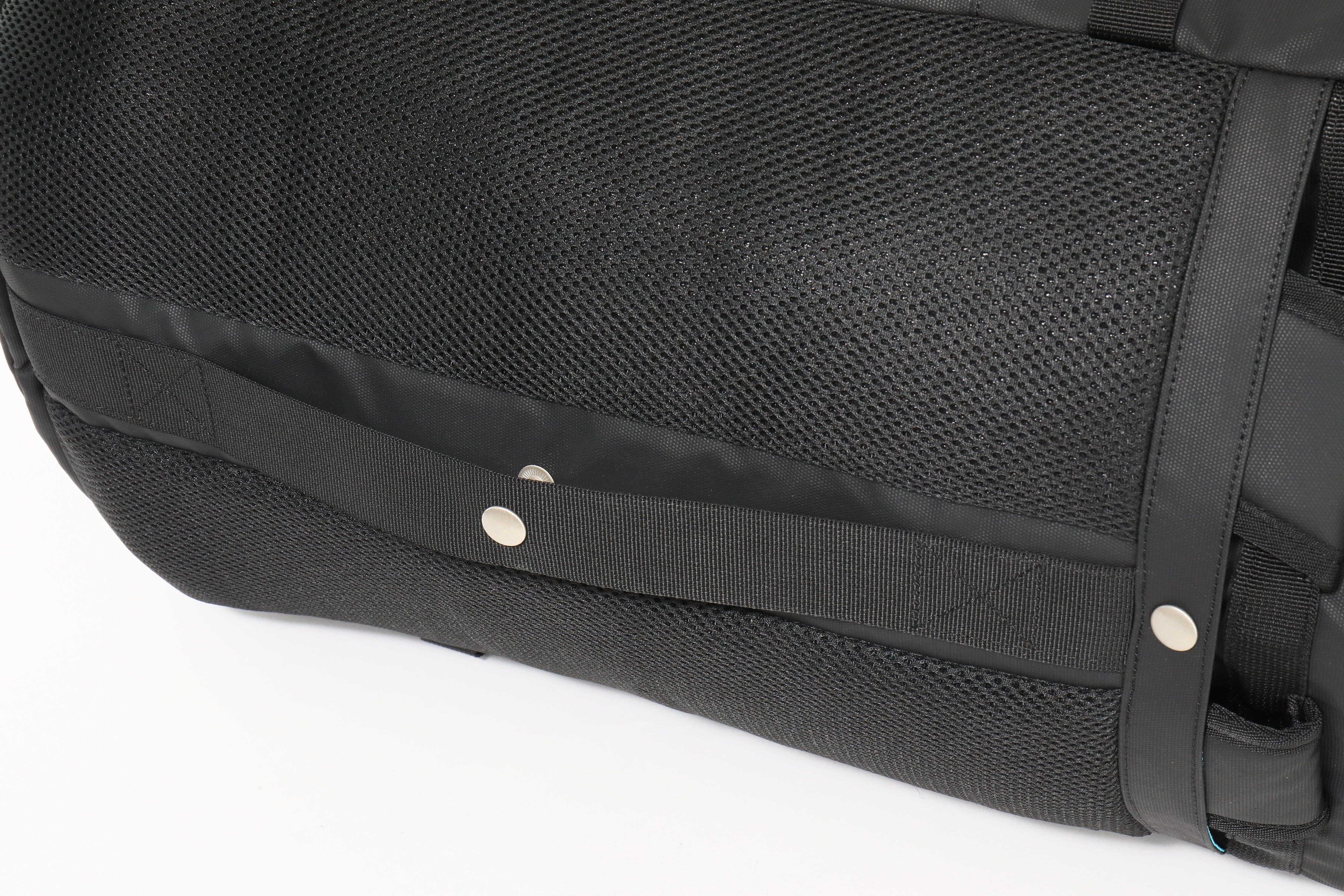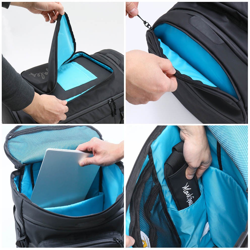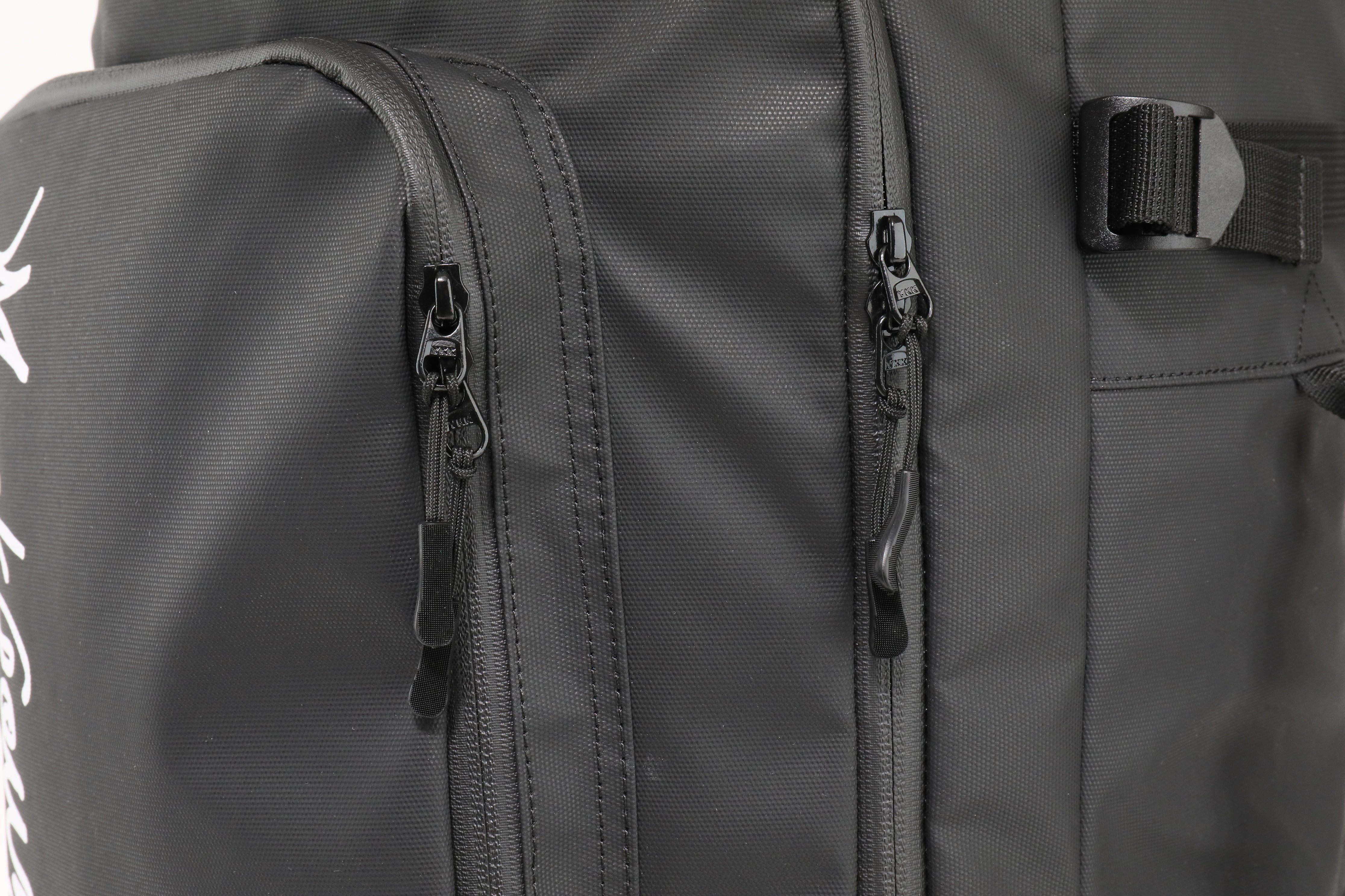 外部のファスナーは全て、YKK止水ファスナーを採用。ファスナーから雨水などが入りにくい仕様になっております。YKKファスナーなので開け閉めがしやすく、耐久性にも優れております。トップ及びサイドのメインルーム部、前ポケット部はダブルファスナーの仕様になっております。