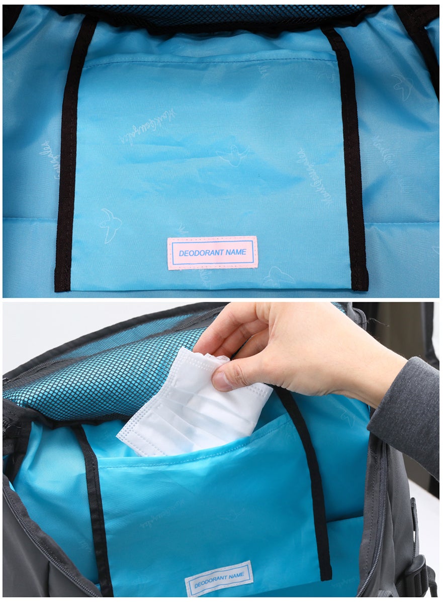 中の吊りポケットに、「デオドラントネーム®」を付属。デオドラントネームとは、日本ダム株式会社の抗菌・消臭効果を備えたフィルムラミネートネームです。マスクやハンカチ等を収納しておくのに便利です。 ※抗菌効果はネーム上のみで、離れた部位にまで効果は及びません。