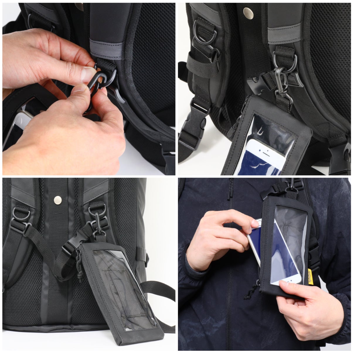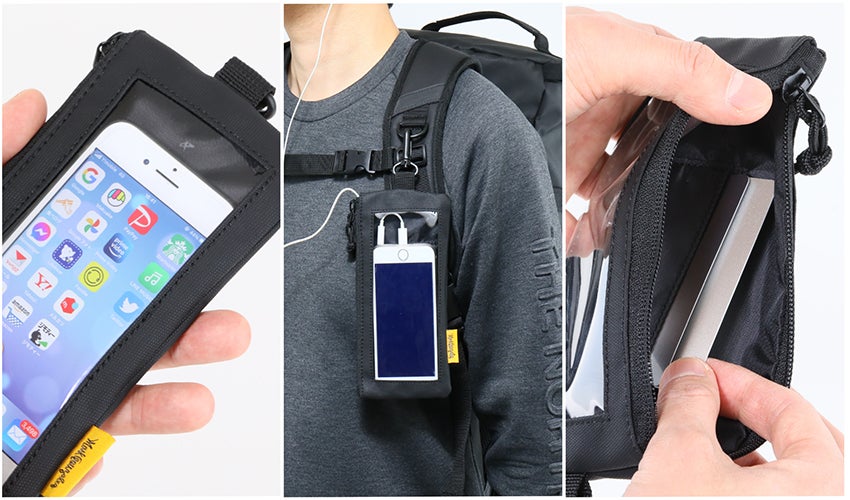 セット品1つ目として、スマホポーチが付属します。タッチパネル対応なので、ポーチに収納したままスマホが操作でき、コード付きイヤフォンを使用した時にも便利です。Dカンなどに取り付け・取り外しができ、洋服にポケットが少ない女性にも、スマホの取り出しがしやすいようになっております。※スマホやスマホケースのサイズによっては、入らない or 入りにくい場合があります。