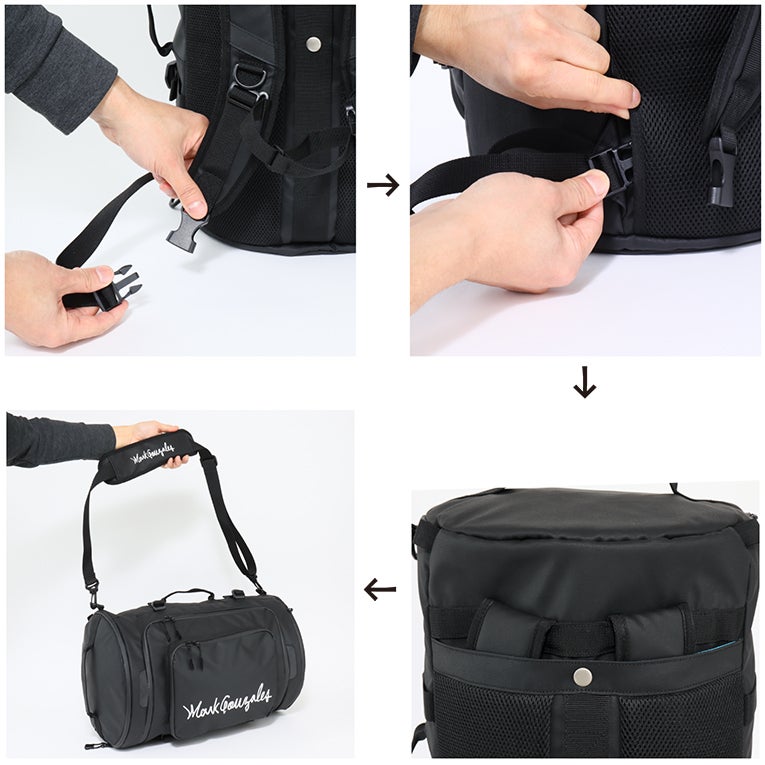 リュック、ショルダー、手持ち の3WAY仕様。リュックベルトはバッグ背面に収納でき、簡単に「縦使用」から「横使用」に変更することができます。リュックの背面は、通気性のよいメッシュ素材・クッション入りで、快適な背負い心地を実現。チェストベルト付きで、肩への負担を軽減します。