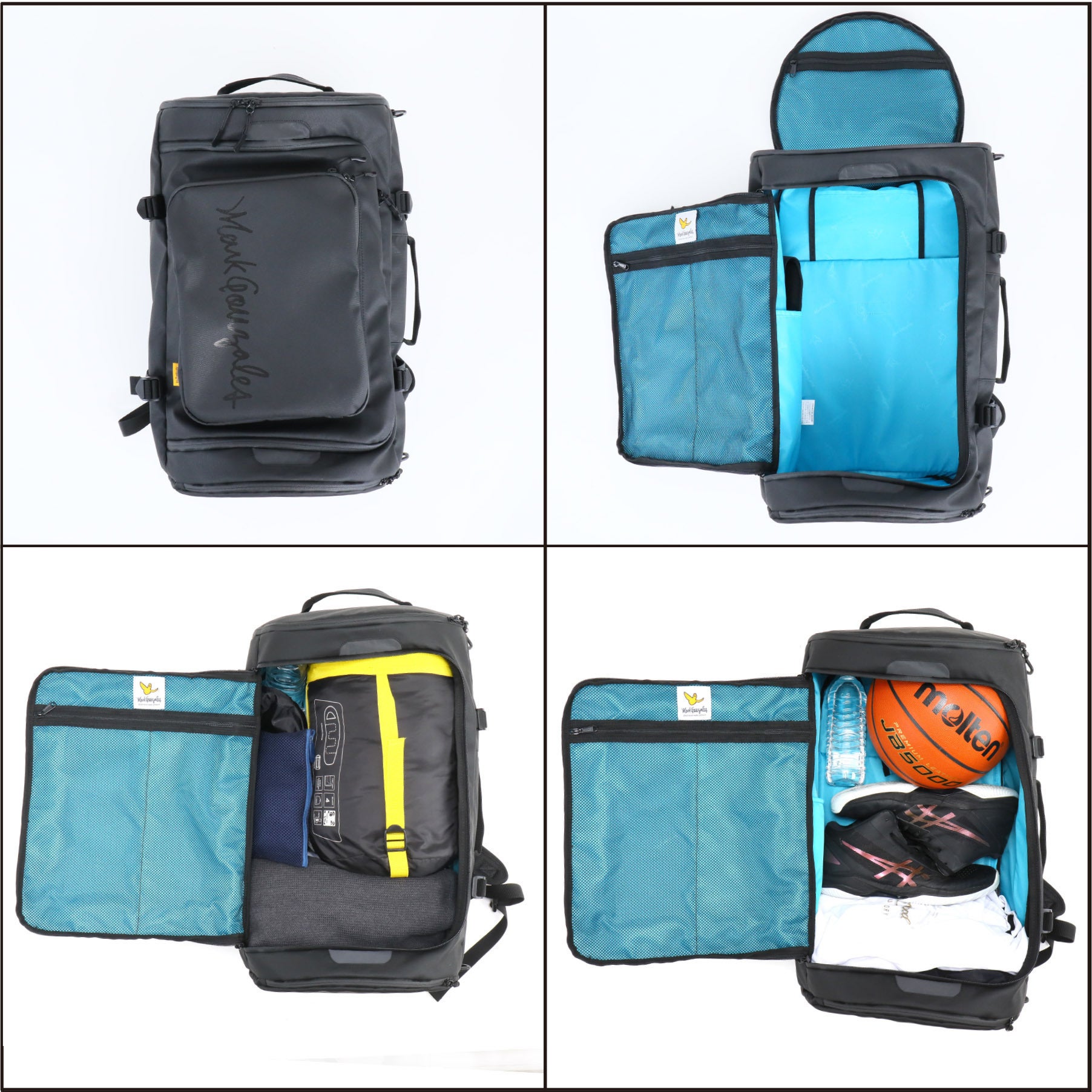 メイン収納、各ポケット等含め、約50リットル入る大容量のバッグです。着替えや寝袋、シューズやボールも入る容量なので、1~3泊の旅行、釣りやキャンプ、サッカーやバスケットボールなど、スポーツのシーンでもお勧めです。