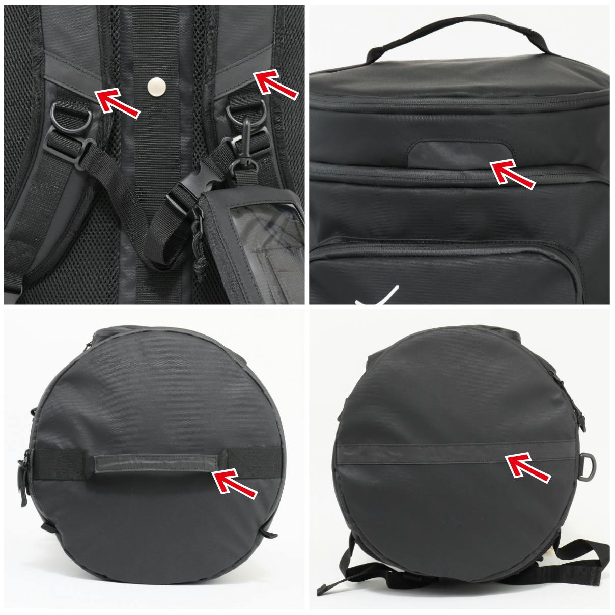 ①約50L 入る大容量 ②3WAY仕様 ③撥水性、軽量のPUコーティング素材