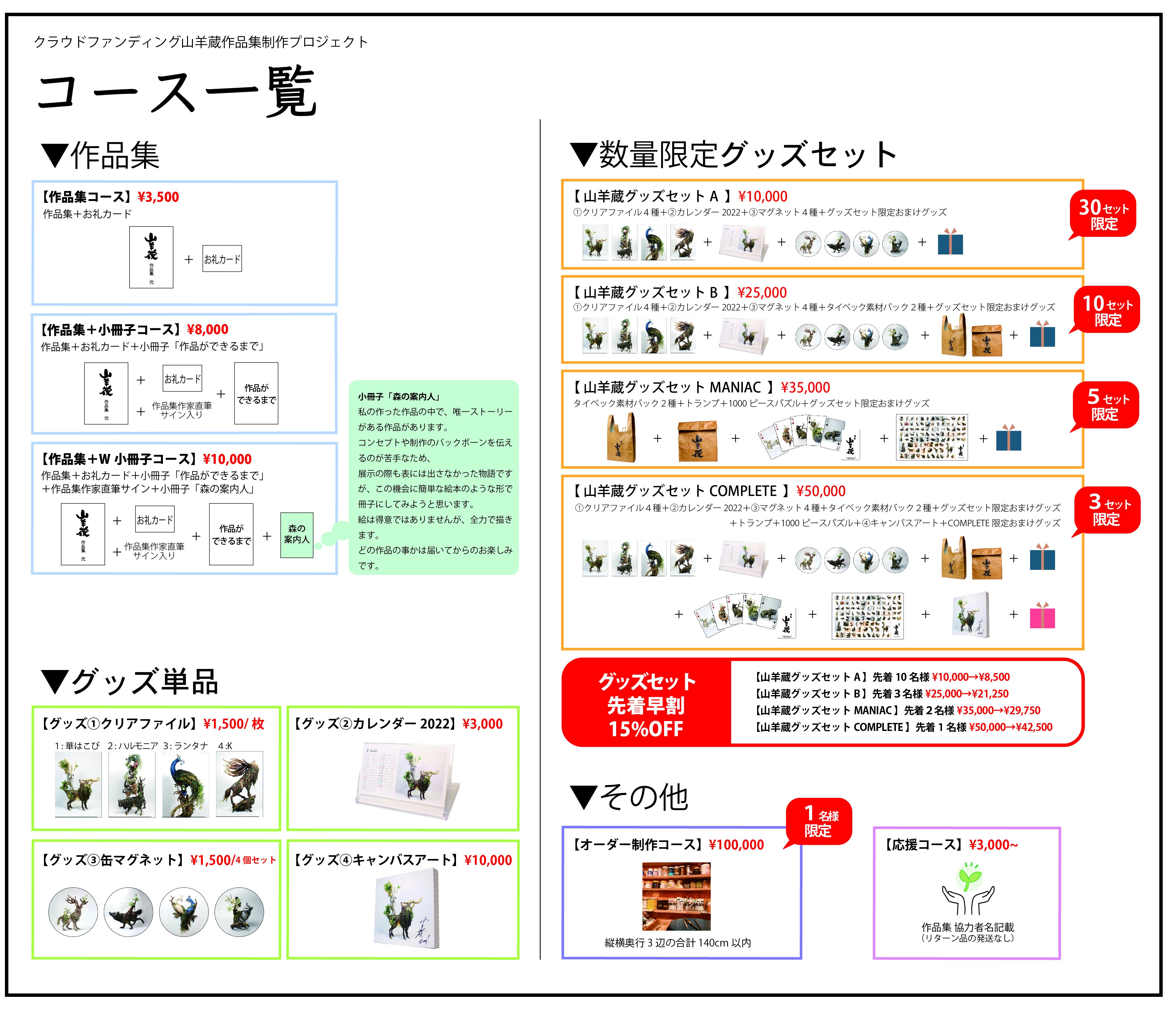 また、前作「山羊蔵作品集-壱」は全額自費で制作しましたが、展示での販売収入がない今、私には資金力がありません。今後も活動を続け、新たな作品を生み出し続けて行くために、どうか皆さまのお力をお借りできないか、と思いこのプロジェクトを立ち上げました。