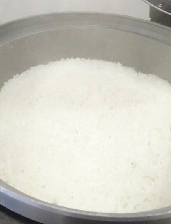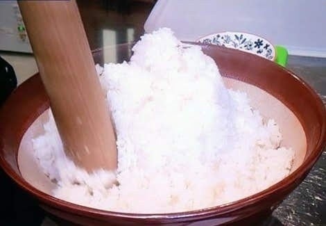 炊き立てのご飯(岐阜県産コシヒカリ)を手作業で半分ほど潰し、
