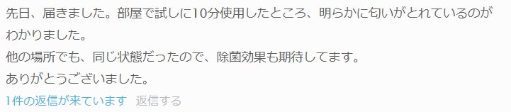 除菌効果はもちろんのこと、お部屋の雑菌臭や洗濯物の生乾き臭(これも雑菌の繁殖によるものなので)、靴箱の臭いなどを軽減できるので、効果が実感しやすい商品だと思います。