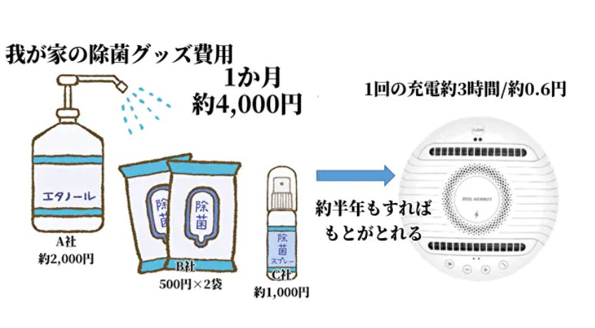 長い目でみると、いろいろな除菌製品を買うよりもランニングコストがかならない計算となります。