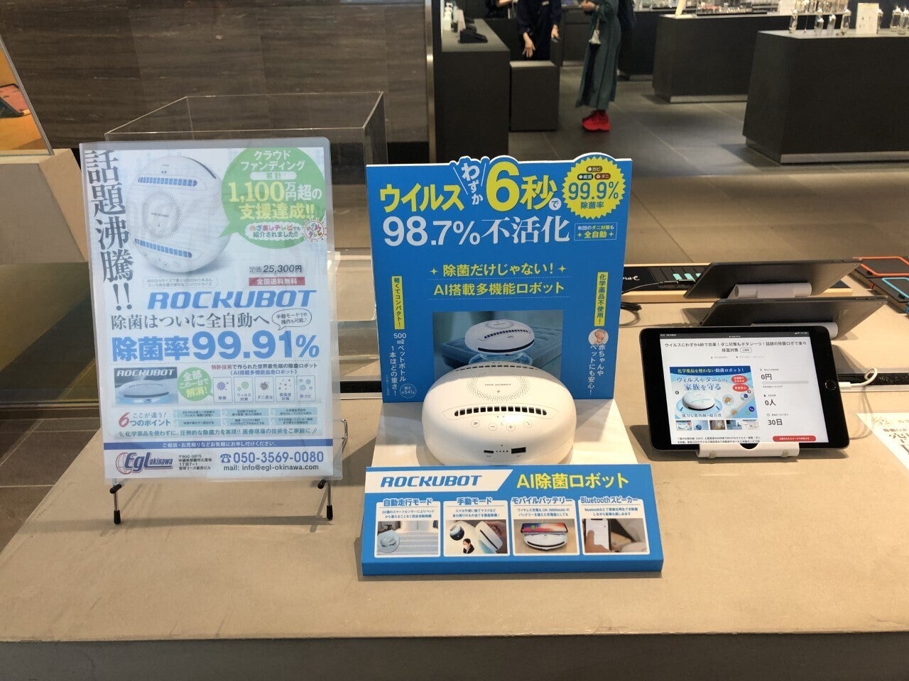 さて、写真の件ですが、7月31日まで、渋谷PARCOの1階「BOOSTERスタジオ」にて、除菌ロボットROCKUBOTと姉妹品の空間除菌ができるROCKUBOTAirの実物が展示されております。
