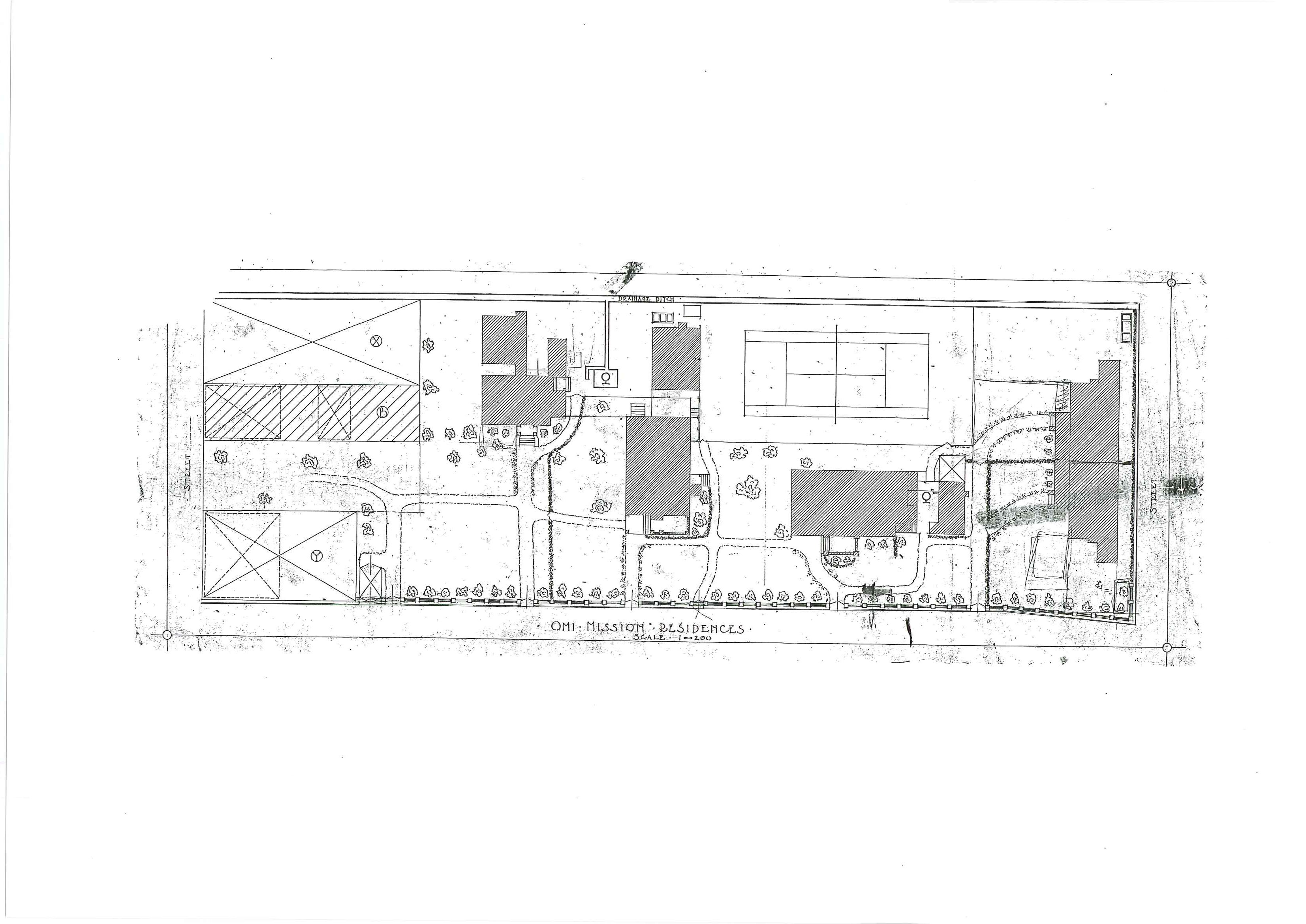 池田町の洋館街の図面 右からダブルハウス(現存)テニスコート(現存せず) テニスコートの下側は旧ヴォーリズ邸(現存せず) 中央:ウォーターハウス(現存)その左側吉田邸(現存) 左側:旧家庭塾(現存)