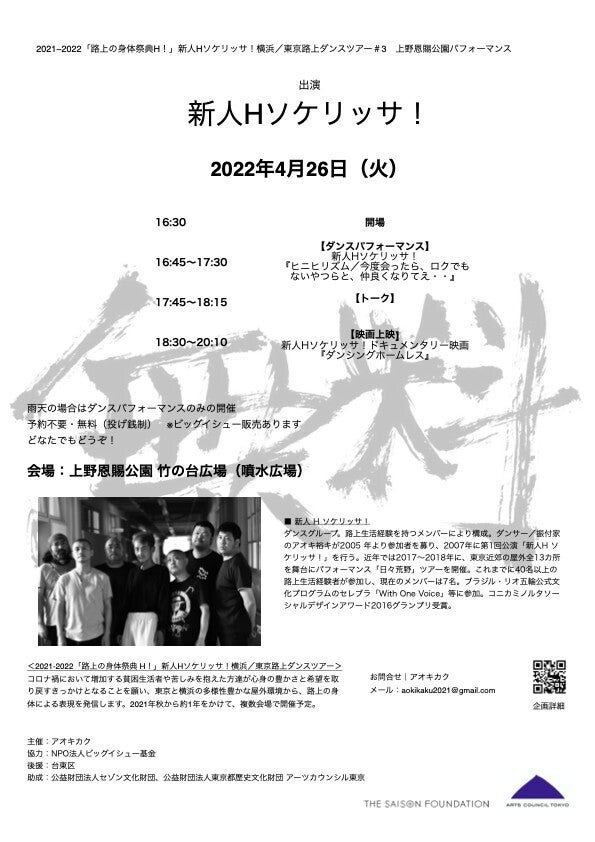 今回はダンスパフォーマンスに加え、新人Hソケリッサ!主演のドキュメンタリー映画『ダンシングホームレス』の屋外上映も予定しています。どうぞお気軽にお越しください!