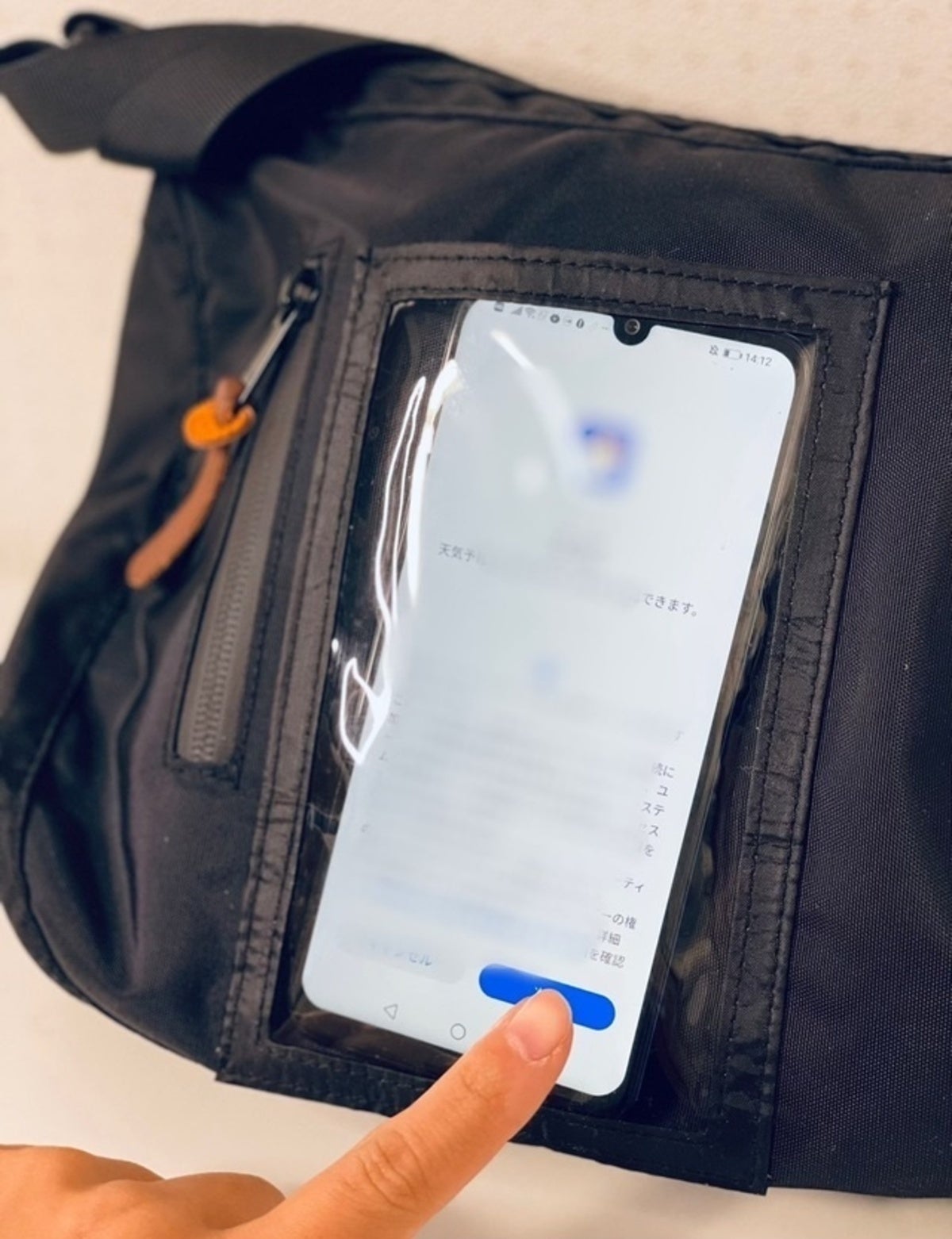 スマホポケットは6.1インチのiPhone12もすっぽり収まり、窓の透明フィルムはタッチパネル対応なのでポケットに入れたまま時計やメールの確認が可能。