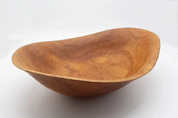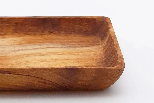 世界三大銘木チーク材を手彫りした木製テーブルウェア。油分や蝋成分を含むため、化学塗料を使わず天然のオリーブオイルだけで仕上げています。また耐久性・耐水性があるので洗剤を使ってジャブジャブ洗え、油ものもへっちゃらです。パンやスイーツはもちろんパスタや煮物などもOK!使えば使うほどチーク材ならではあじがでてくるため、経年変化が楽しめます。