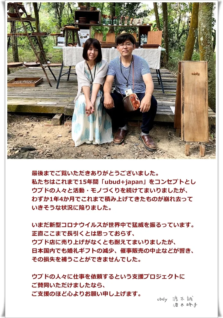そしてこの新しい木彫り事業が子や孫の代まで継承され、共に誓った「世界的な食器ブランドにする」という大きな夢に向かって「ubud+japan」で進みたいと思っております。