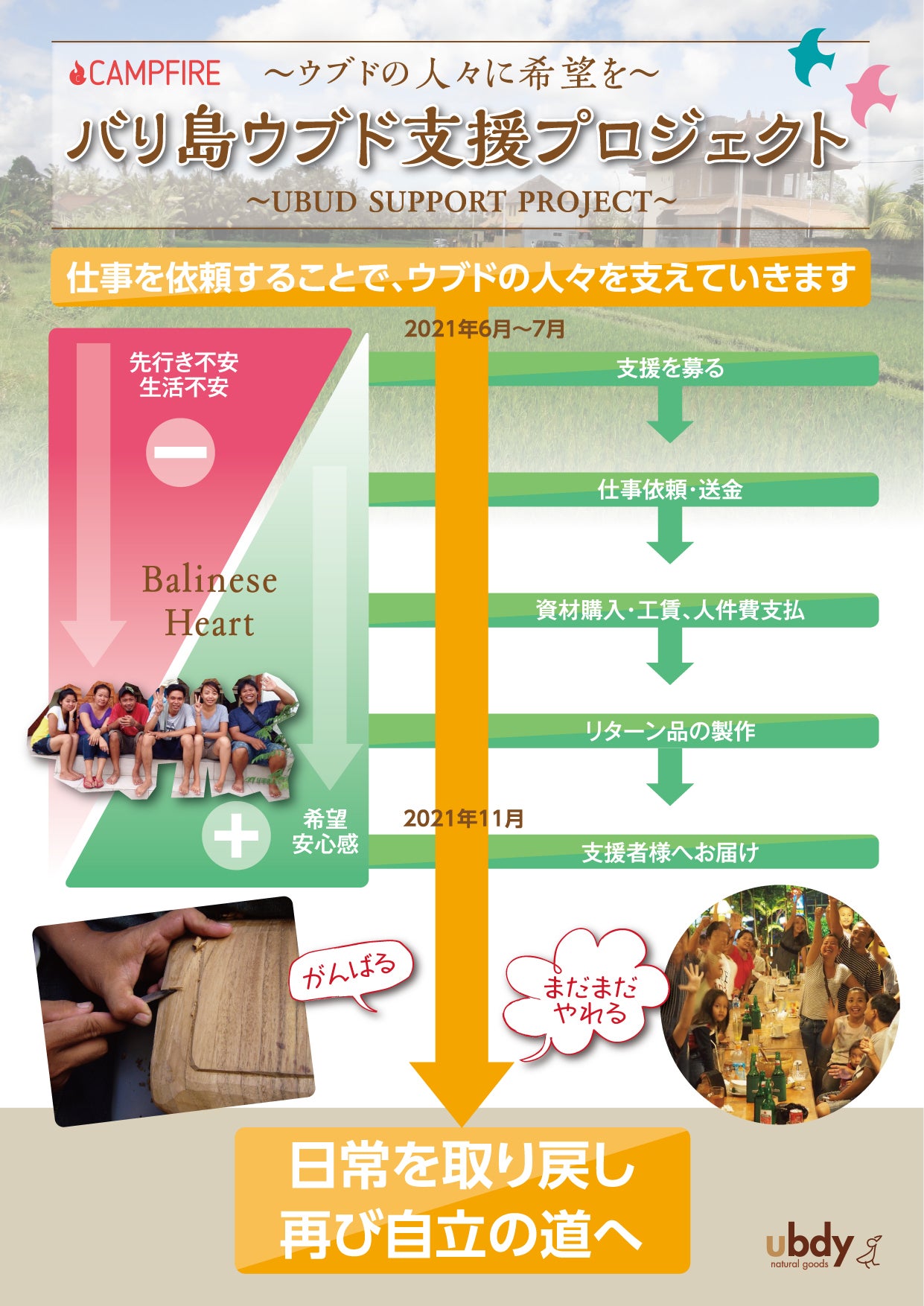 閉店に追い込まれたバリ島ウブドの人々に希望を与えたい。木彫り職人はもちろん、店舗スタッフ、メンテナンススタッフ、資材を提供してくれる業者、鉄職人など、コロナ不況により苦しむウブドの人々の生活を守るために仕事を依頼したい。