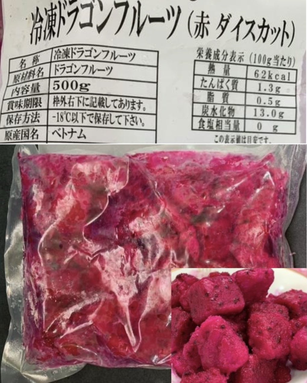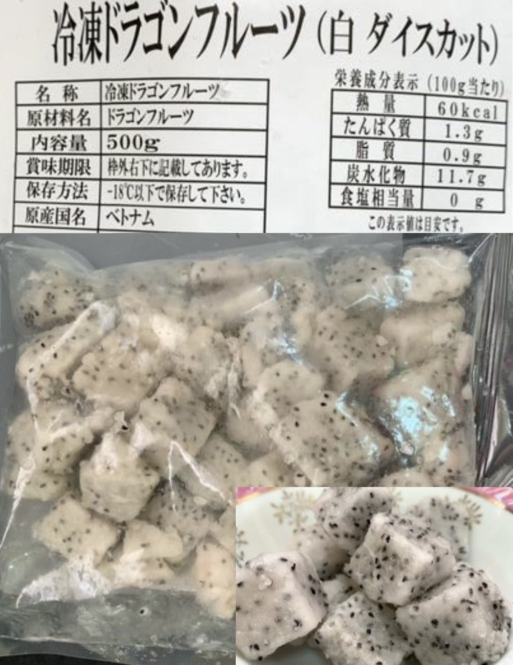 ドラゴンフルーツ:半解凍でそのままデザートとしてお召し上げれます。注)水分が多いフルーツですので全解凍をしてしまうと水分だけが溶け出してしまうので、半解凍以下がお勧めです。