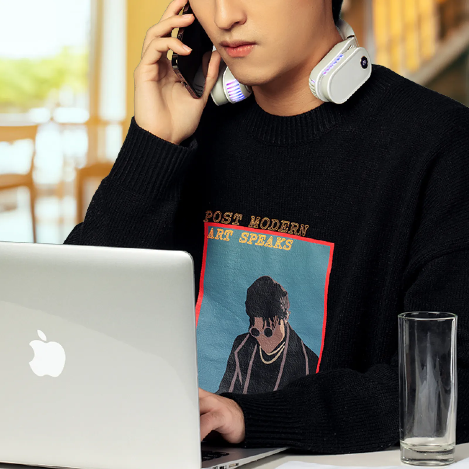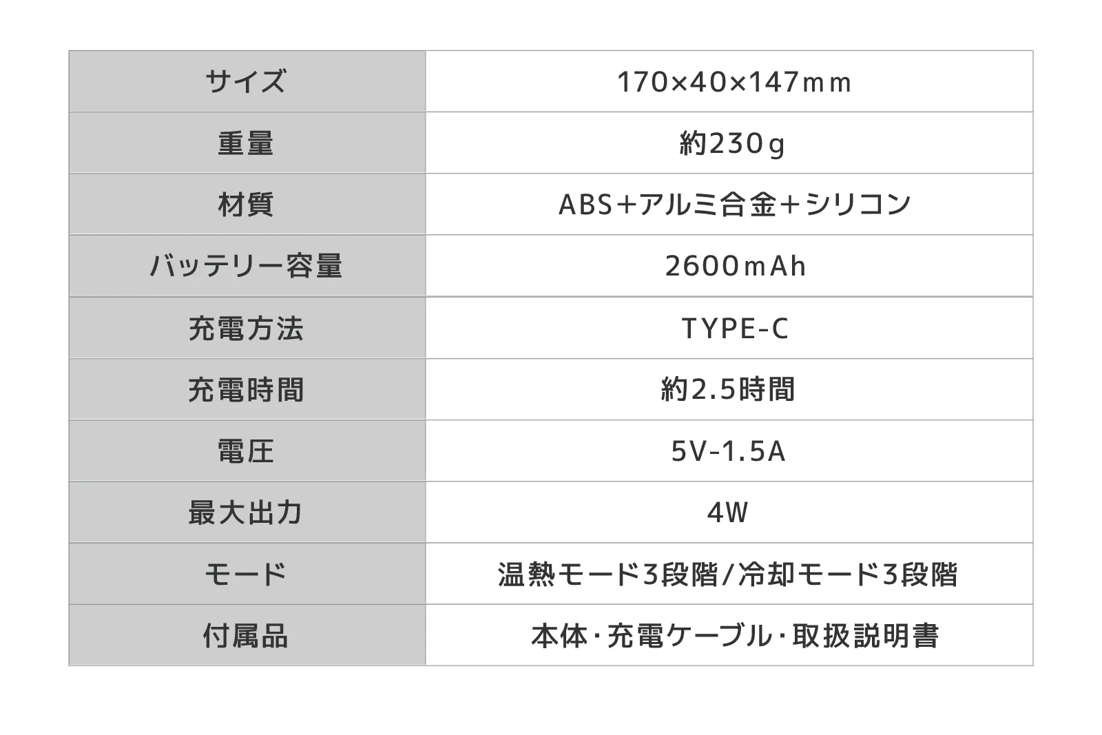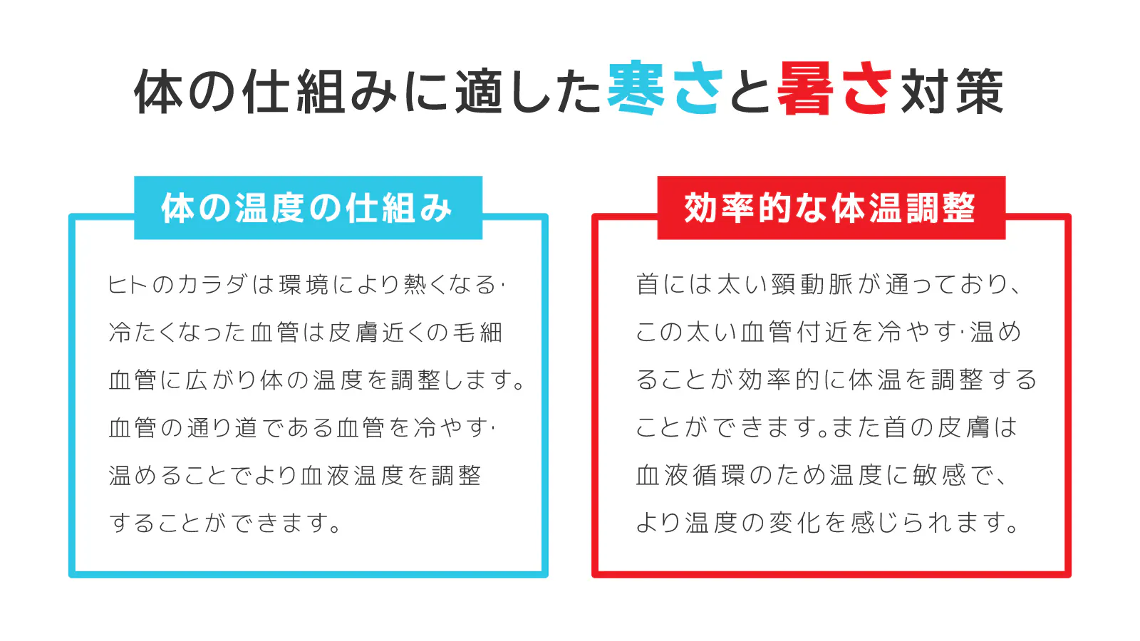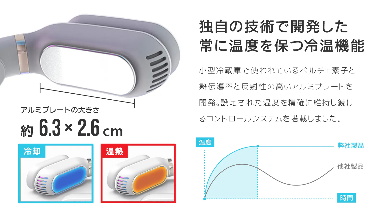 一昔前は夏にクーラー、冬はヒーターと使い分けされていたのが 大手メーカーの努力によりエアコンが開発されて年中対応できるようになりました。 今人気の首掛け扇風機やネッククーラーも、年中対応できるよう進化させるべきとの思いから、 メーカーと開発することとなりました。