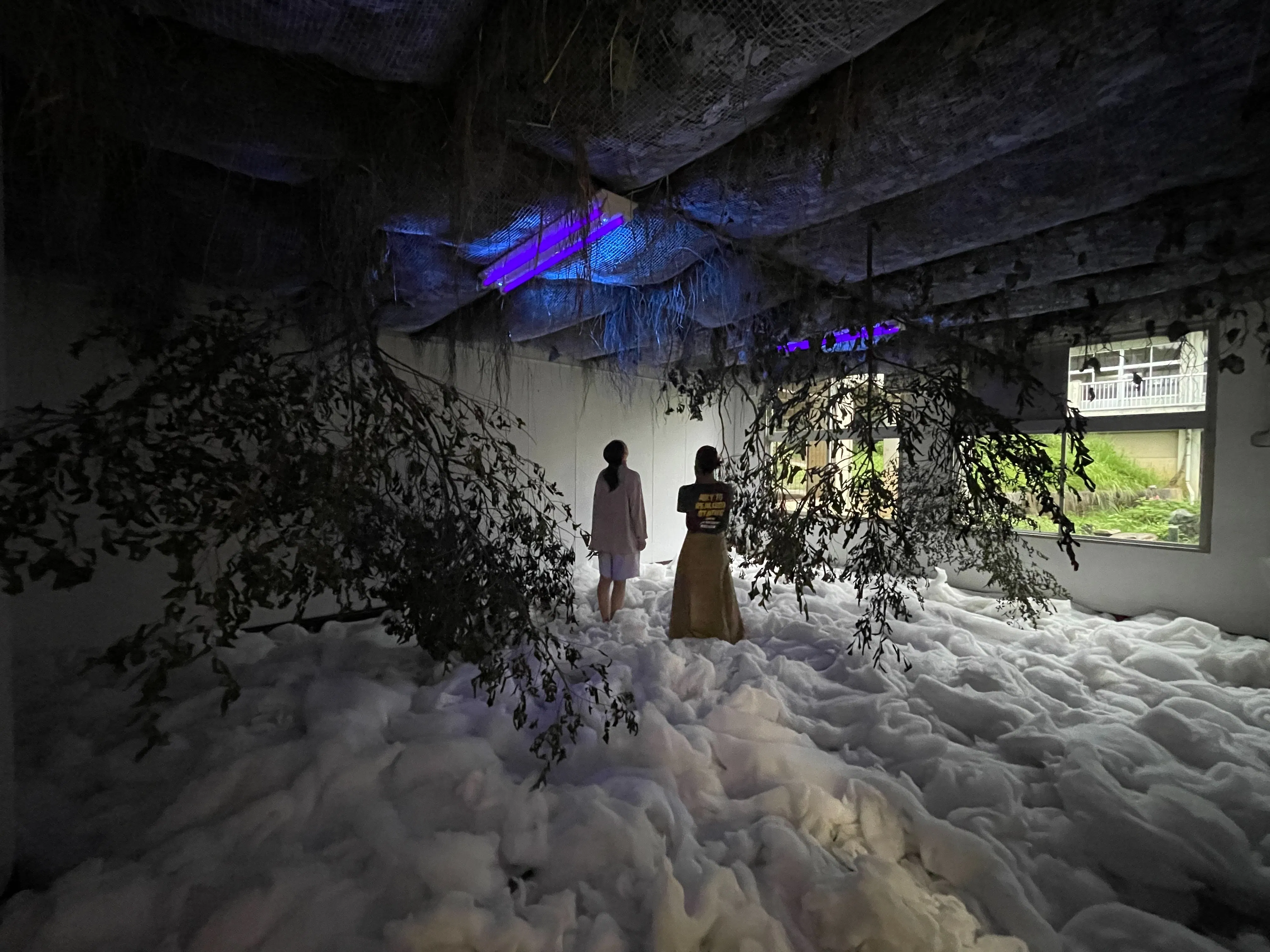 天地逆転(天井の部分は本物の木と草です)している空間を制作しました!