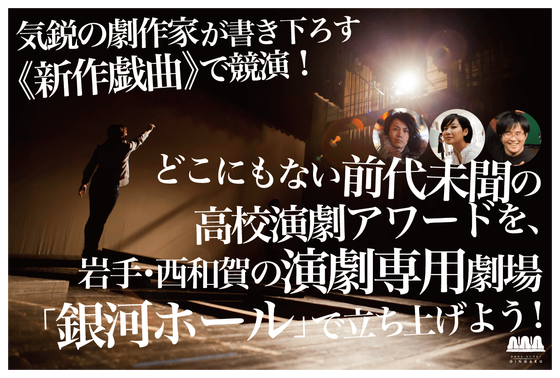 「いわて銀河ホール高校演劇アワード」は、大会ごとに劇作家さんから共通の上演台本として新作を書き下ろしていただく大会として開催します。