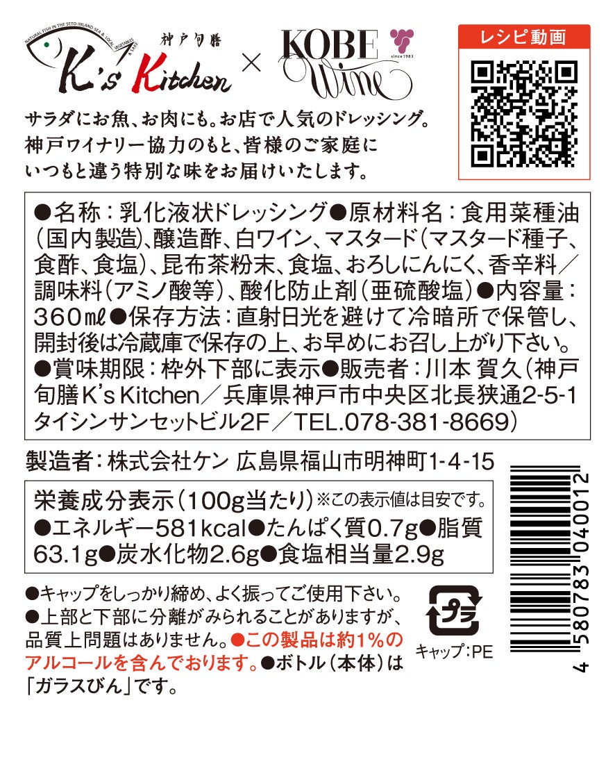神戸旬膳K's Kitchenのシェフ川本賀久がお店で手造りで仕上げて、ご来店を賜りましたお客様にご提供し続けてきたドレッシングを、この度ソース類の加工専門企業様や何よりも神戸ワインを生産する「神戸みのりの公社」様の多大なるご協力を仰ぐことによって、一般の家庭においてお店と同じレベルの美味しさをお届けできるように開発した新商品です。